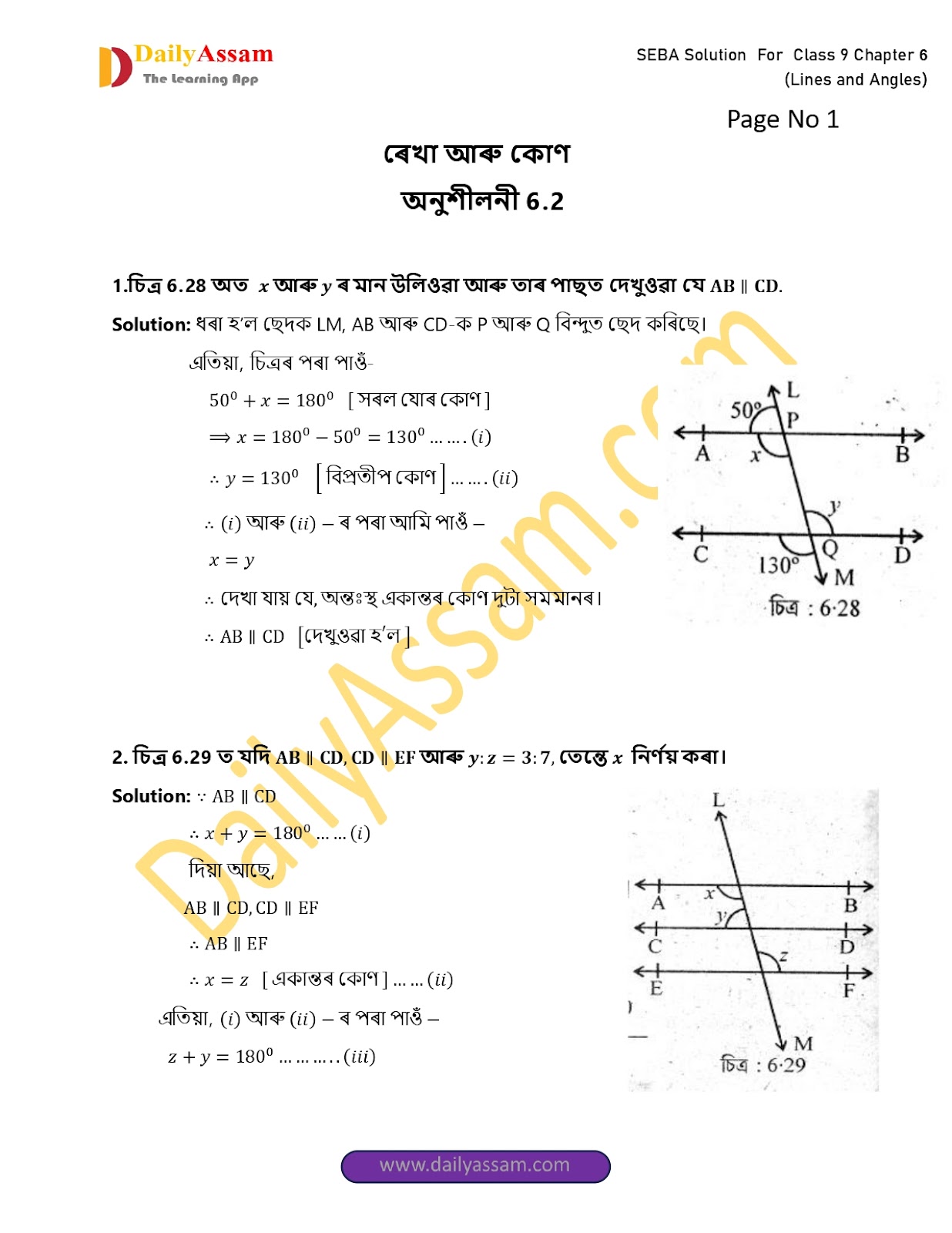 1. চিত্ৰ 6.28 অত X আৰু Y ৰ মান উলিওৱা আৰু তাৰ পাছত দেখুওৱা যে AB || CD.