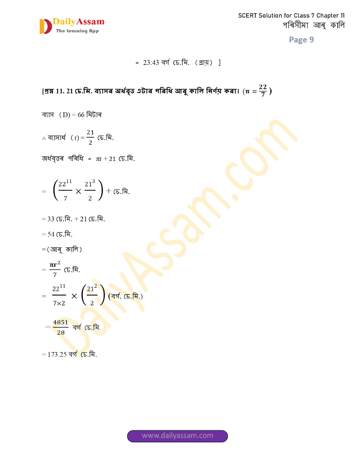 11. 21 চে মি ব্য়াসৰ অৰ্ধবৃত্ত এটাৰ পৰিধি আৰু কালি নিৰ্ণয় কৰা।