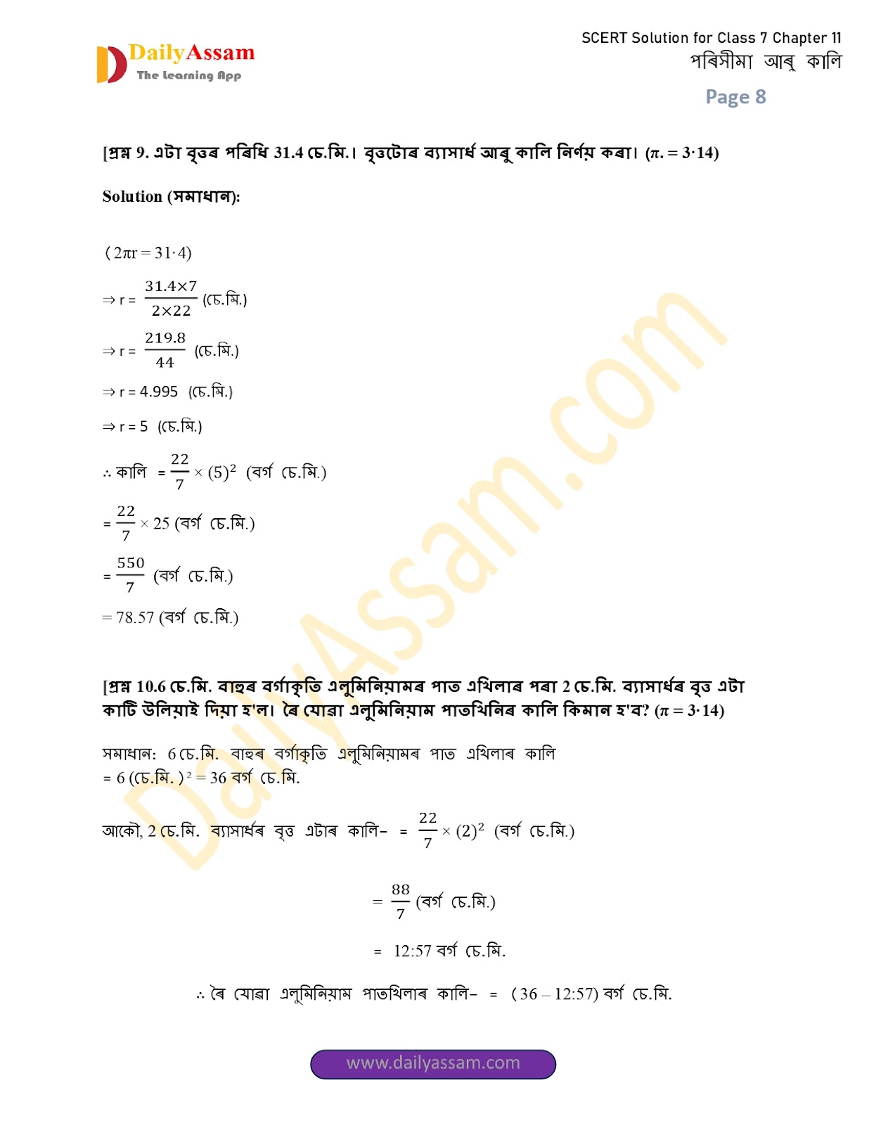 9. এটা বৃত্তৰ পৰিধি 31.4 চে মি। বৃত্তটোৰ ব্য়াসাৰ্ধ আৰু কালি নিৰ্ণয় কৰা।