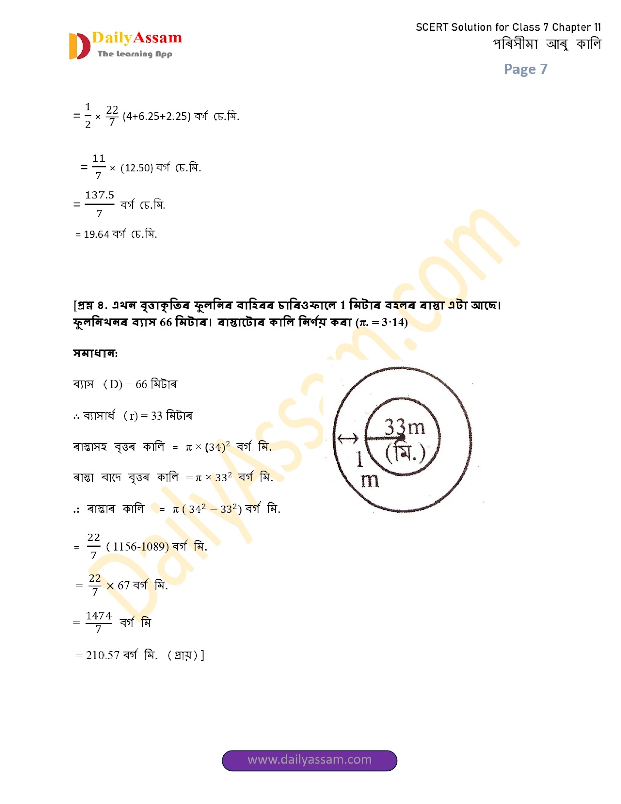8. এখন বৃত্তাকৃতিৰ ফুলনিৰ বাহিৰৰ চাৰিওফালে 1 মিটাৰ বহল ৰাস্তা এটা আছে। ফুলনিখনৰ ব্য়াস 66 মিটাৰ। ৰাস্তাটোৰ কালি নিৰ্ণয় কৰা।