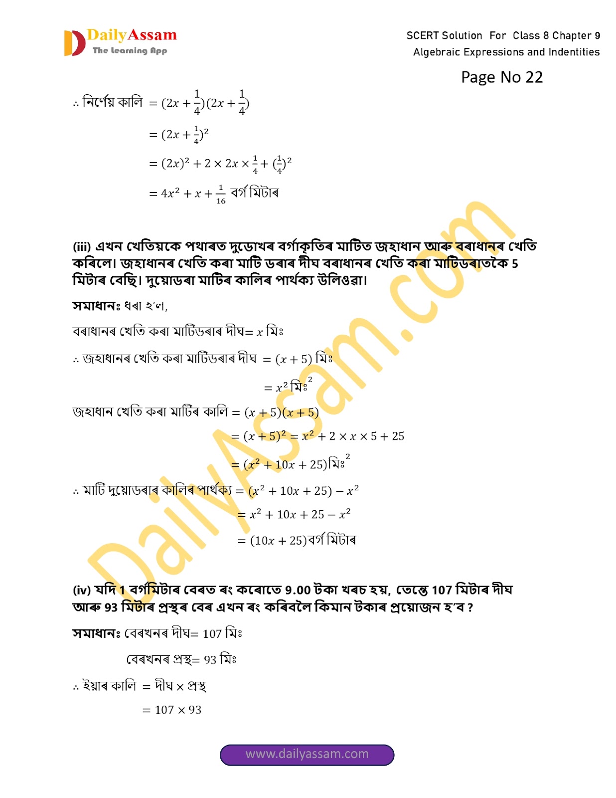 i) এখন আয়তাকৃতি খেলপথাৰৰ দীঘ (x+8) মিটাৰ. প্ৰস্থ দীঘতকৈ 3 মিটাৰ কম। খেসপথাৰখনৰ কালি উলিওৱা।