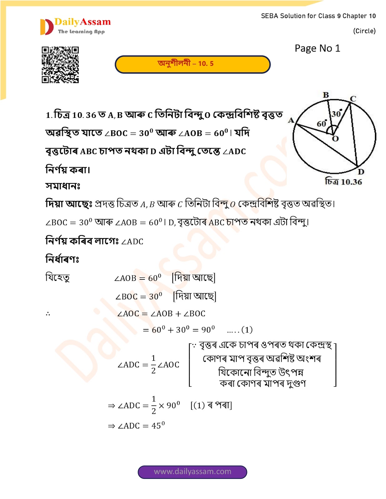 1. চিত্ৰত A, B আৰু C তিনিটা বিন্দু O কেন্দ্ৰবিশিষ্ট বৃত্তত অৱস্থিত যাতে ∠BOC = 30॰ আৰু ∠AOB = 60॰। যদি বৃত্তটোৰ ABC চাপত নথকা D এটা বিন্দু তেন্তে ∠ADC নিৰ্ণয় কৰা।