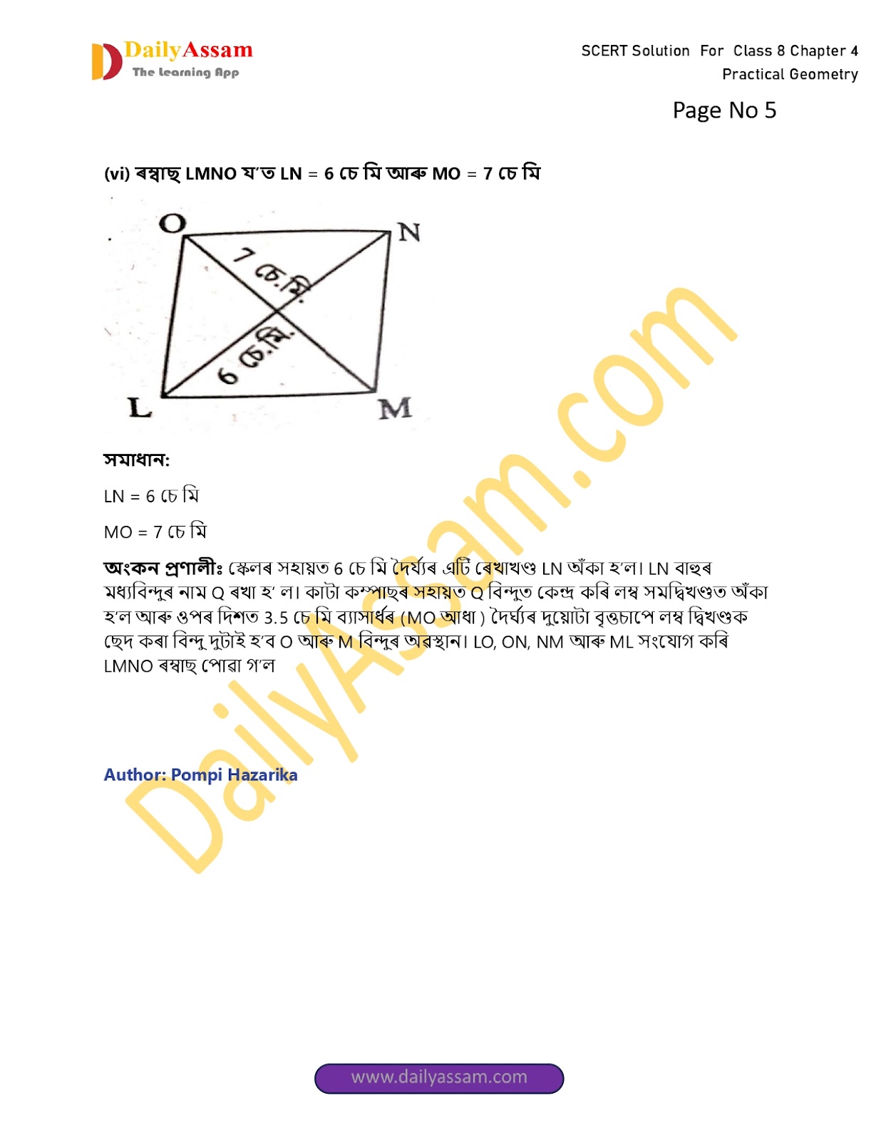 স্কেলৰ সহায়ত 6 চেমি দৈৰ্ঘ্যৰ এটি ৰেখাখণ্ড LN অঁকা হ’ল । LN বাহুৰ মধ্যবিন্দুৰ নাম Q ৰখা হ’ল । কাটা কম্পাছৰ সহায়ত Q বিন্দুত কেন্দ্ৰ কৰি লম্ব সমদ্বিখণ্ডত অঁকা হ’ল আৰু ওপৰ দিশত 3.5 চেমি ব্যাসাৰ্ধৰ (MO আধা) দৈৰ্ঘ্যৰ দুয়োটা বৃত্তচাপে লম্ব দ্বিখণ্ডক ছেদ কৰা বিন্দু দুটাই হ’ব O আৰু M বিন্দুৰ অৱস্থান ILO, ON, NM, আৰু ML সংযোগ কৰি LMNO ৰম্বাছ পোৱা গ’ল ।