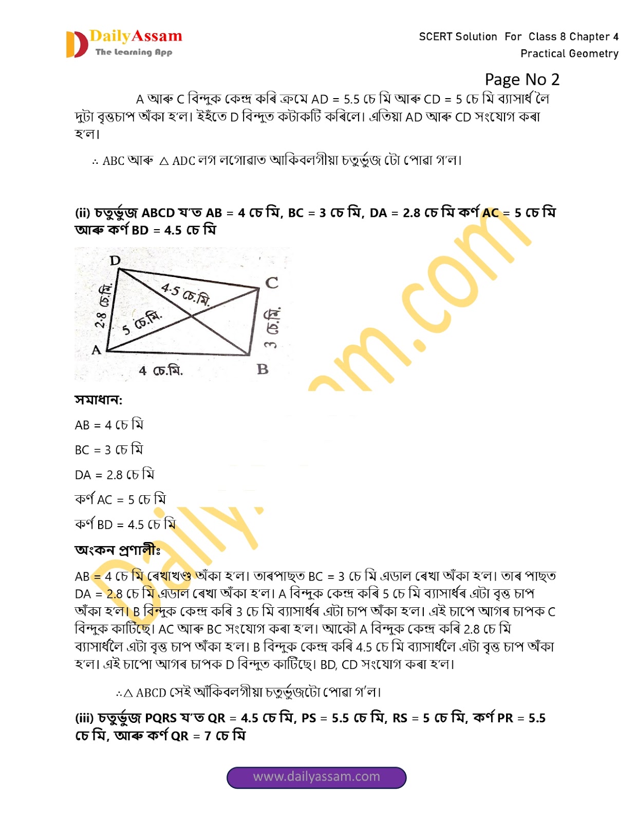 (ii) চতুৰ্ভুজ ABCD য’ত AB= 4 চেমি, BC= 3চেমি, DA= 2.8 চেমি, কৰ্ণ AC= 5 চেমি আৰু কৰ্ণ BD= 4.5 চেমি