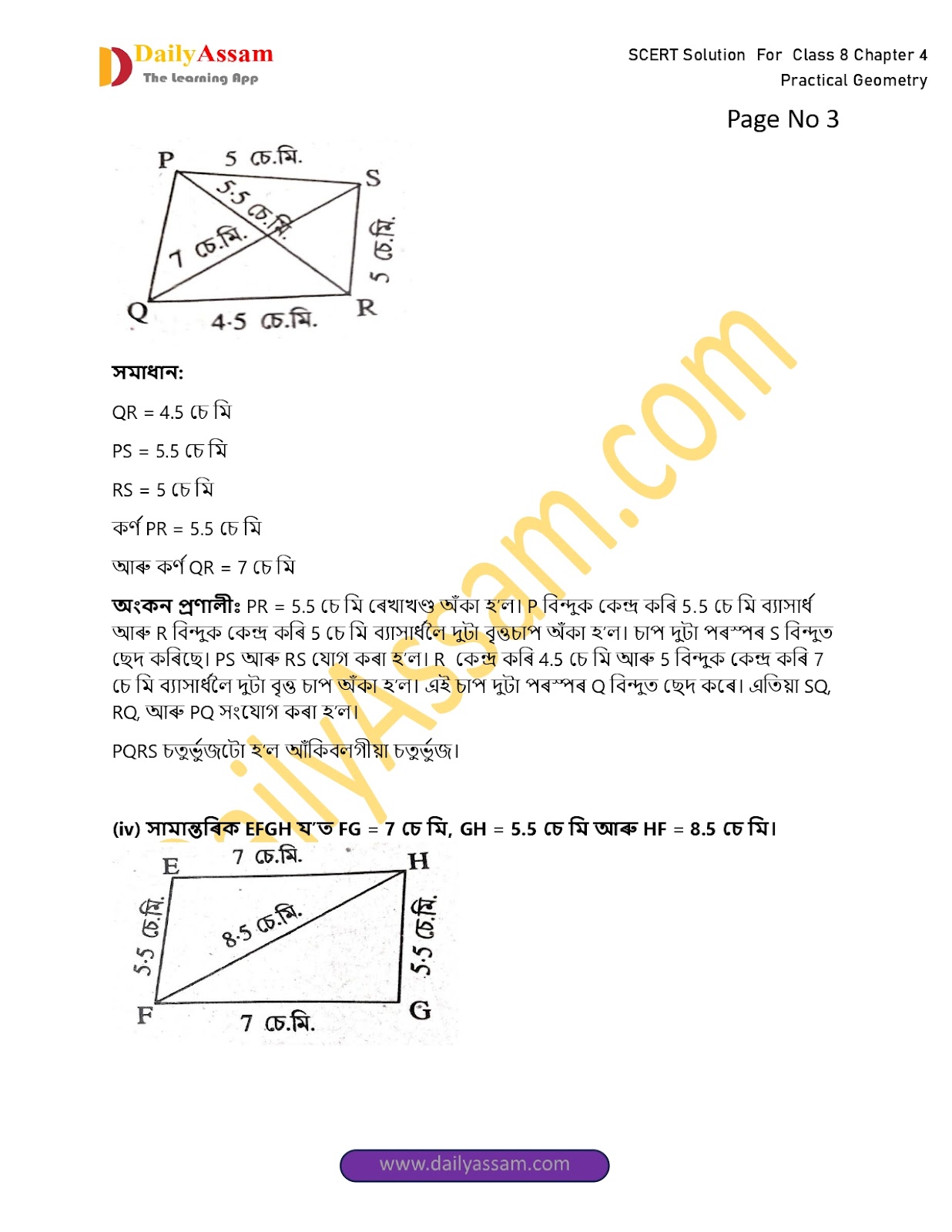 (iii) চতুৰ্ভুজ PQRS য’ত PQ= 4.5 চেমি, PS= 5.5 চেমি, RS= 5 চেমি, কৰ্ণ PR= 5.5 চেমি, আৰু কৰ্ণ QS=T চেমি ।