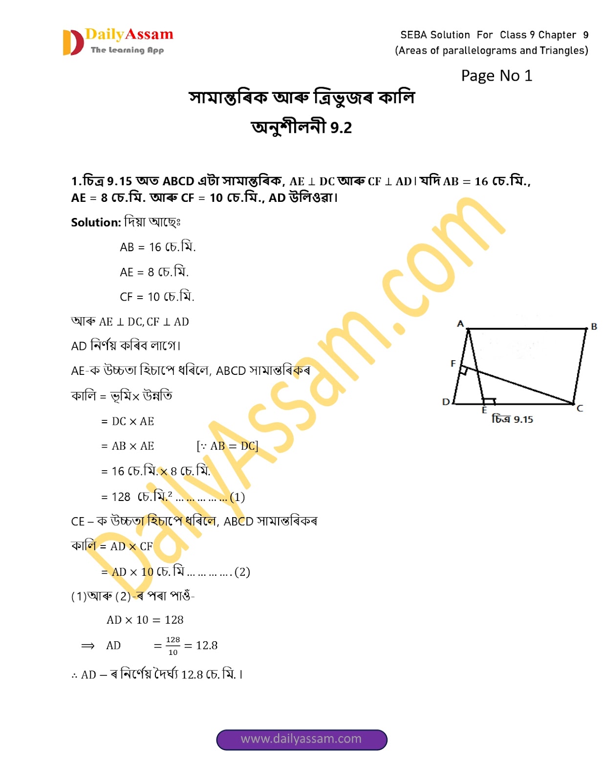 1. ABCD এটা সামান্তৰিক, AE⊥DC আৰু CF⊥AD। যদি AB = 16 cm, AE = 8 cm আৰু CF = 10 cm, AD উলিওৱা।