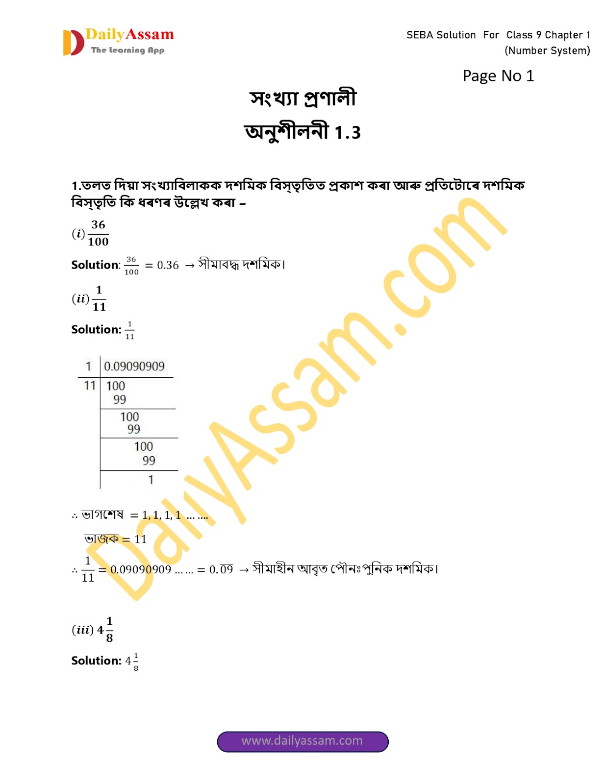 1. তলত দিয়া সংখ্য়া বিলাকক দশমিক বিস্তৃতিত প্ৰকাশ কৰা আৰু প্ৰতিটোৱে দশমিক বিস্তৃতি কি ধৰণৰ উল্লেখ কৰা।