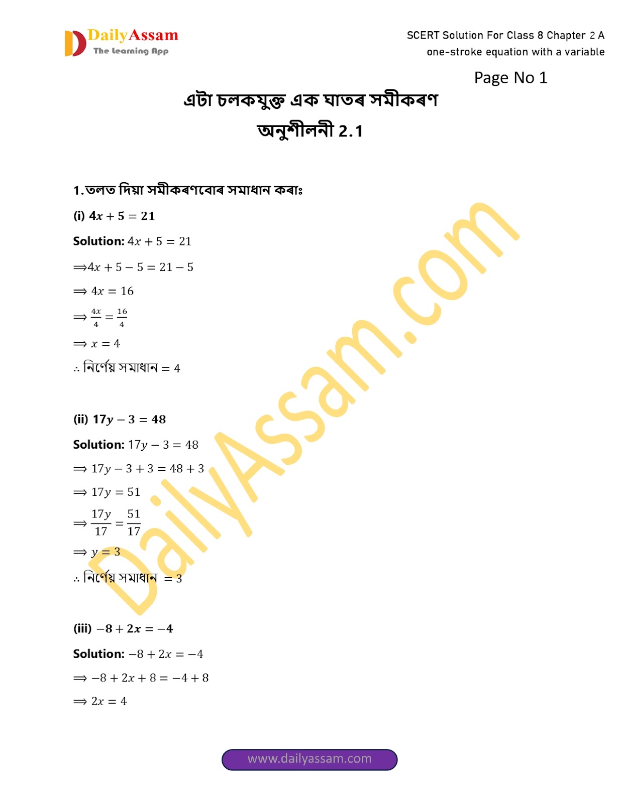 1. তলত দিয়া সমীকৰণবোৰ সমাধান কৰা ঃ