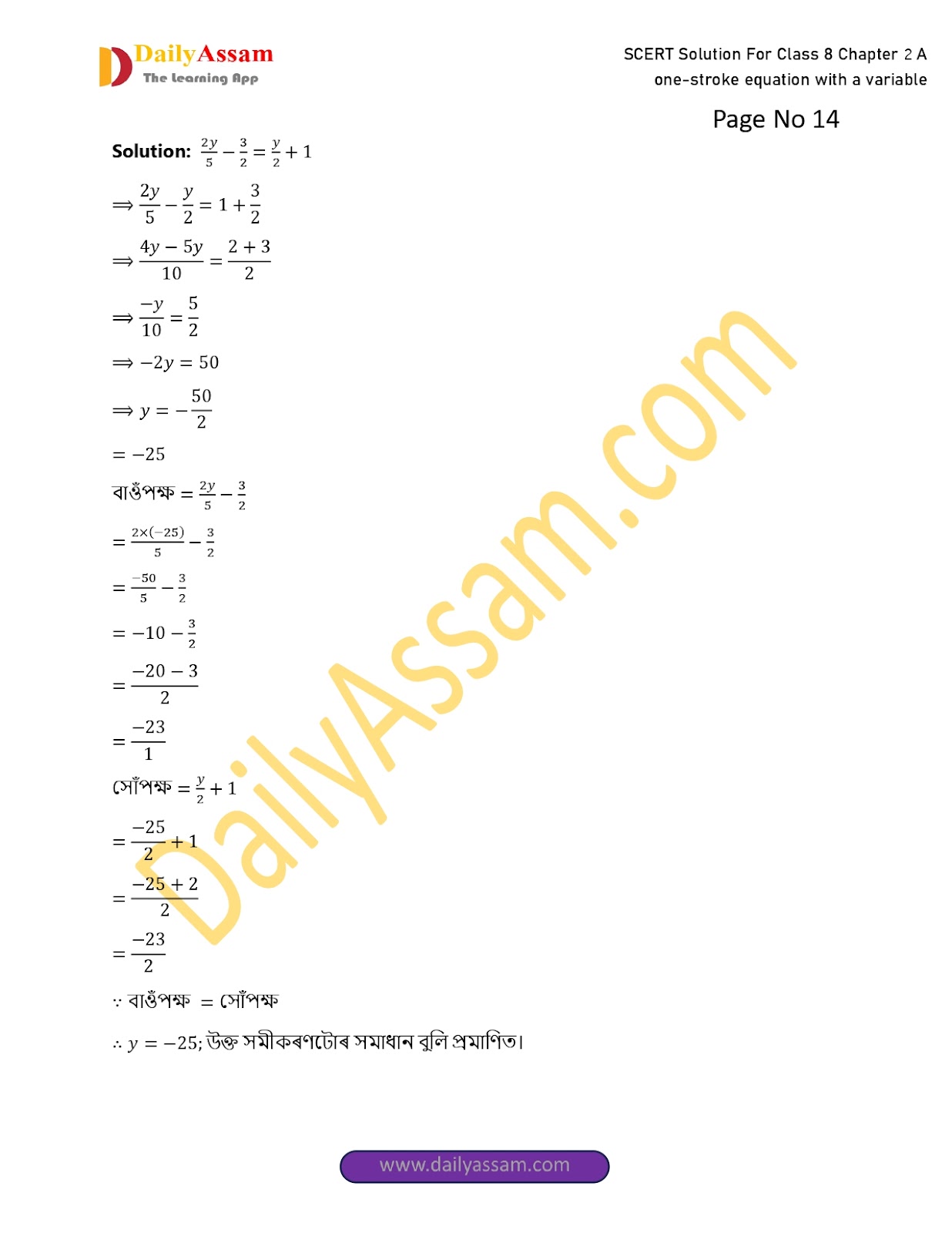 ∴ y = -25; উক্ত সমীকৰণটোৰ সমাধান বুলি প্ৰমাণিত ।