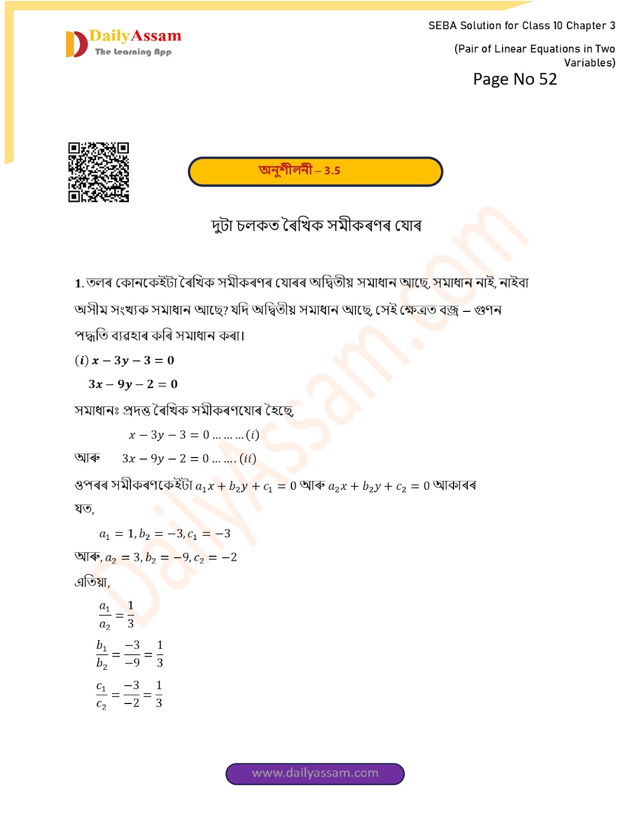a1/a2 = 1/3 আৰু b1/b2 = -1/-3 = 1/3 আৰু c1/c2 = -3/-2 = 3/2