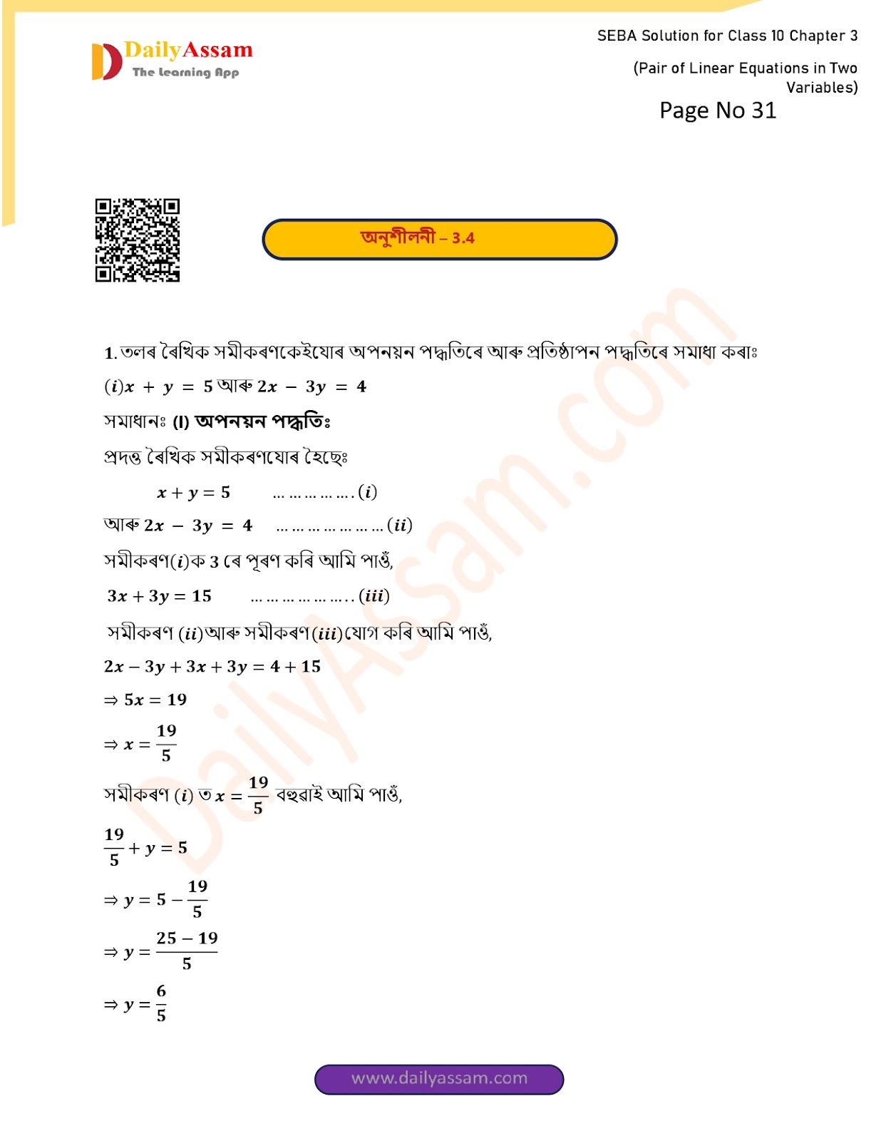 1. তলৰ ৰৈখিক সমীকৰণকেইযোৰ অপনয়ন পদ্ধতিৰে আৰু প্ৰতিষ্ঠাপন পদ্ধতিৰে সমাধা কৰাঃ
