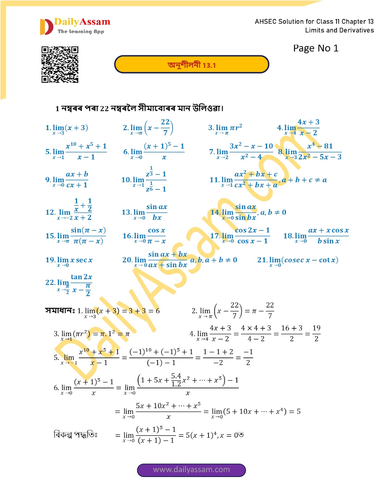 AHSEC Class 11 Mathematics Chapter 13 Solution | Assam Board Class 11 Mathematics Chapter 13 সীমা আৰু অৱকলজ (LIMITS AND DERIVATIVES) Answer | 2025 -2026