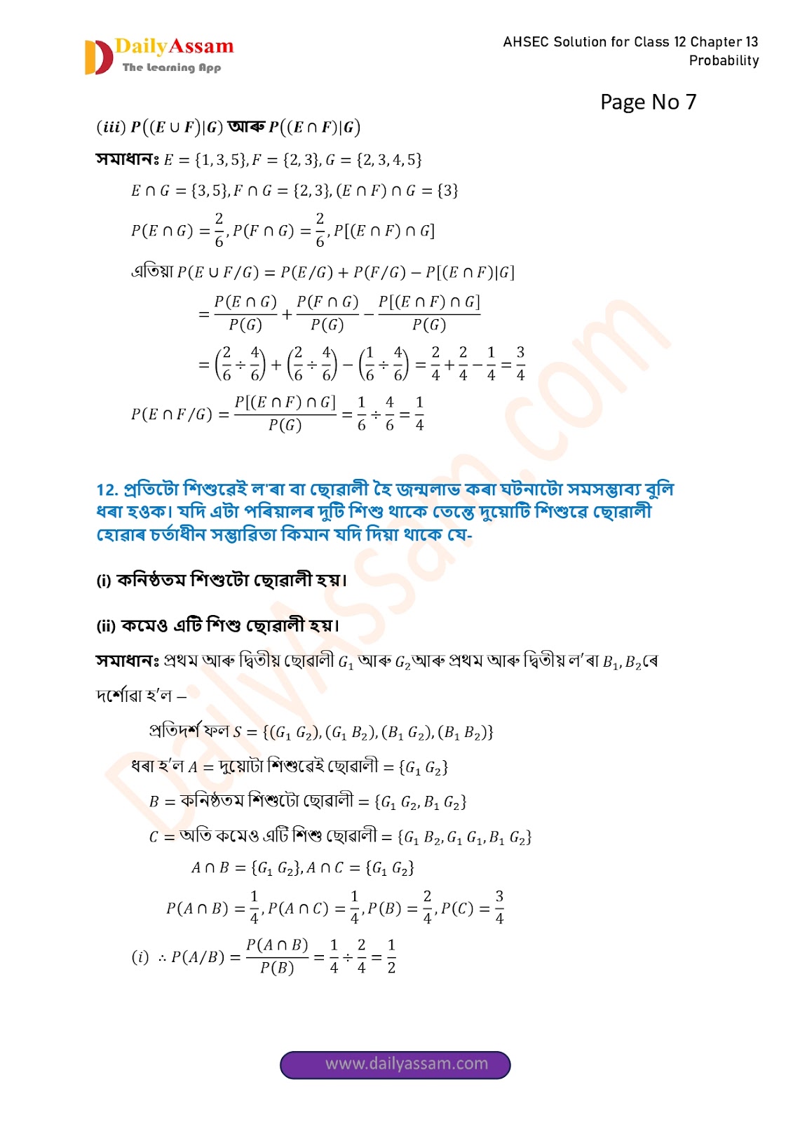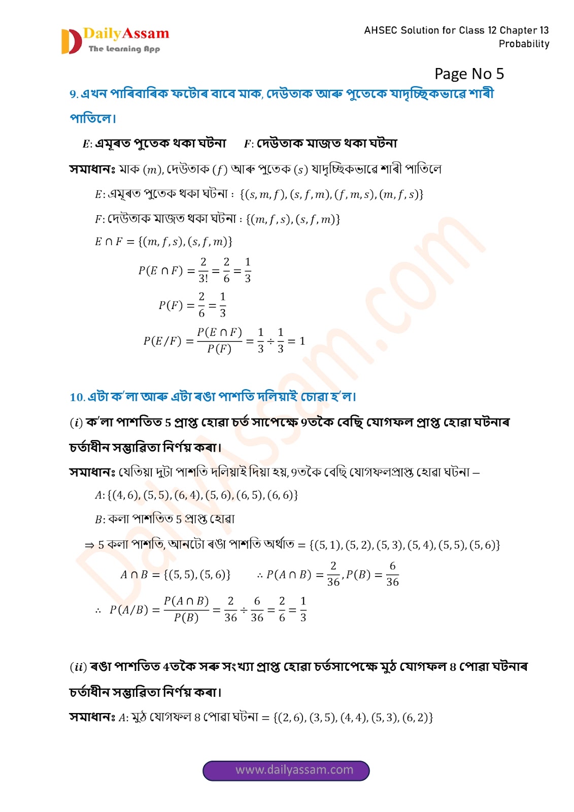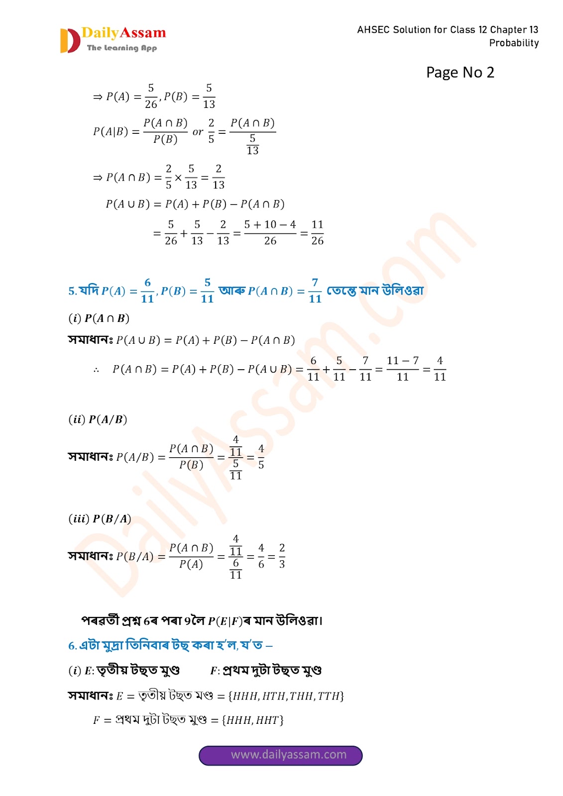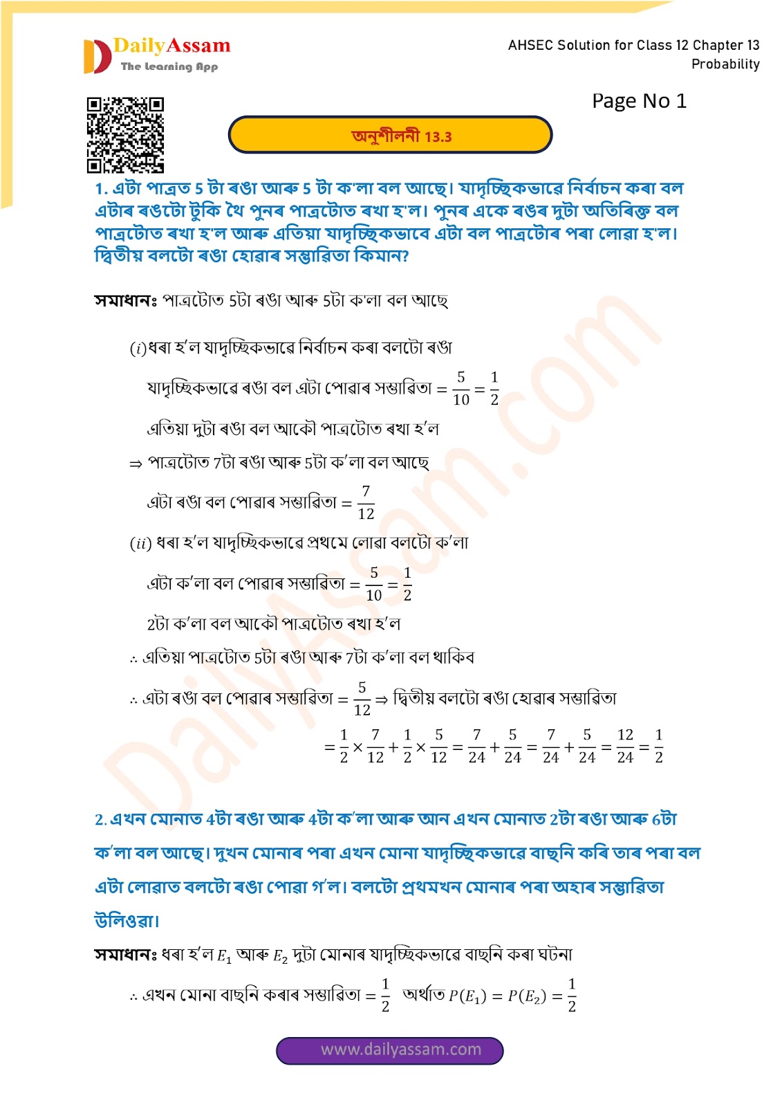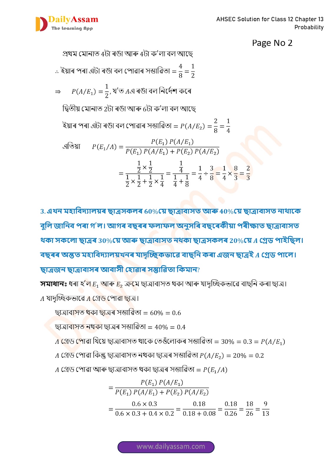AHSEC Class 12 Mathematics Part 2 Chapter 13 Solution | Assam Board Class 12 Mathematics Part 2 Chapter 13 সম্ভাৱিতা (probability) Answer | 2025 - 2026