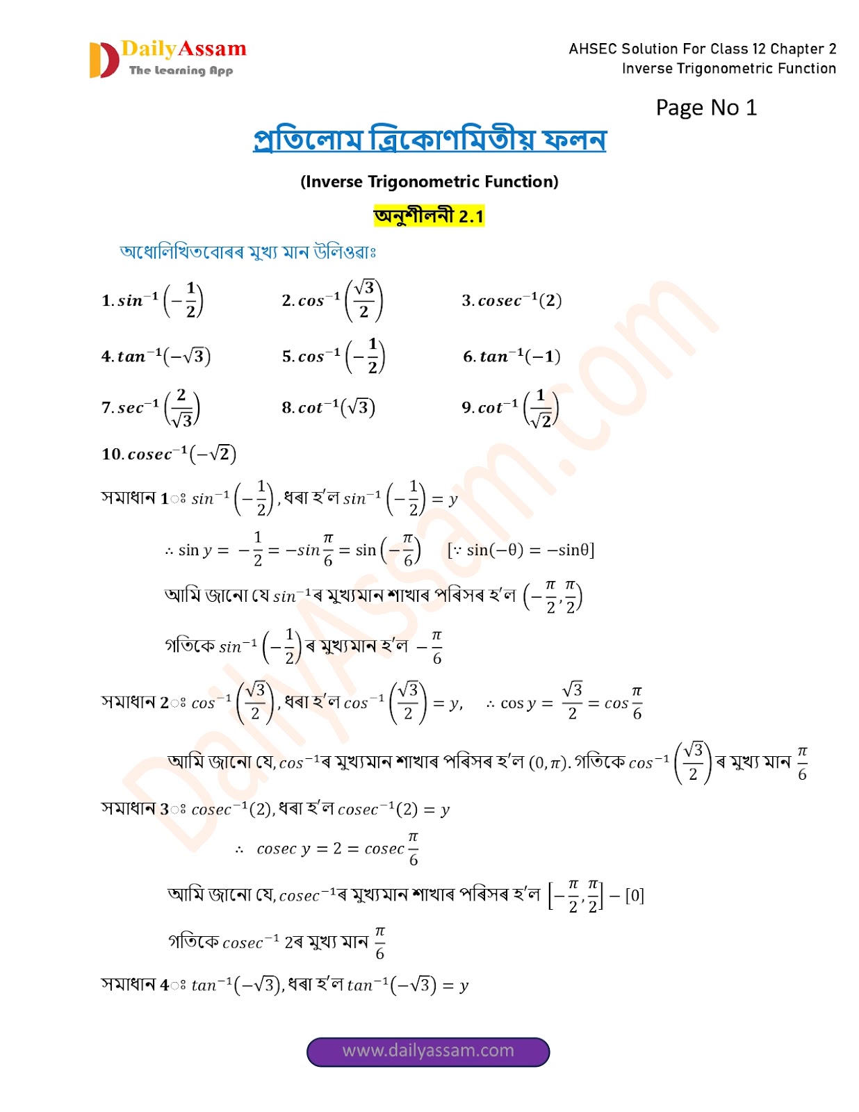 AHSEC Class 12 Mathematics Part 1 Chapter 2 Solution I Assam Board Class 12 Mathematics part 1 Chapter 2 প্ৰতিলোম ত্ৰিকোণমিতীয় ফলন (Inverse Trigonometric Function) Answer I 2025 - 2026