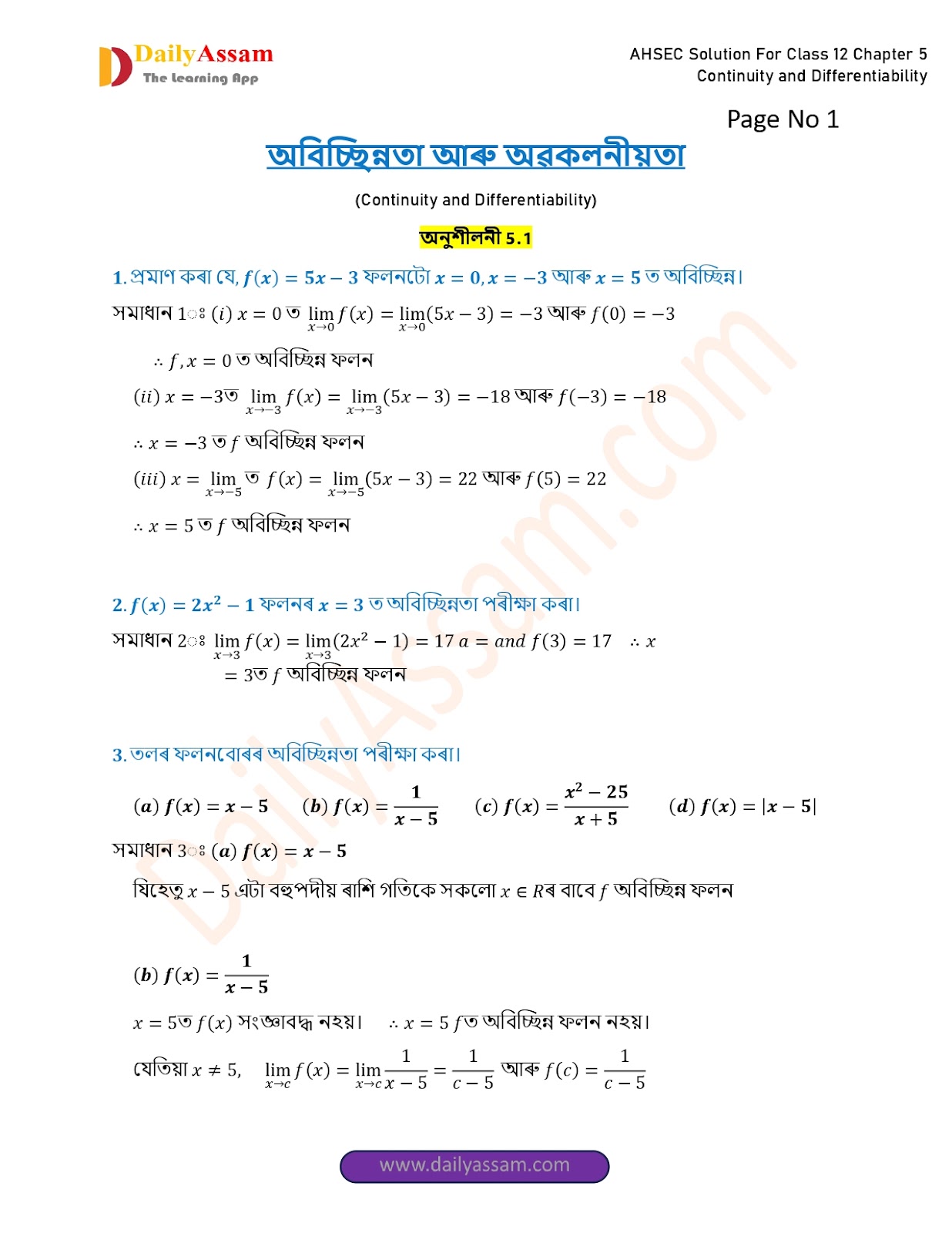 AHSEC Class 12 Mathematics Part 1 Chapter 5 Solution I Assam Board Class 12 Mathematics part 1 Chapter 5 অবিচ্ছিন্নতা আৰু অৱকলনীয়তা (Continuity and Differentiability) Answer I 2025 - 2026