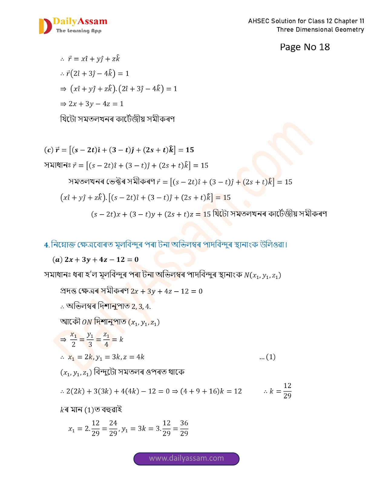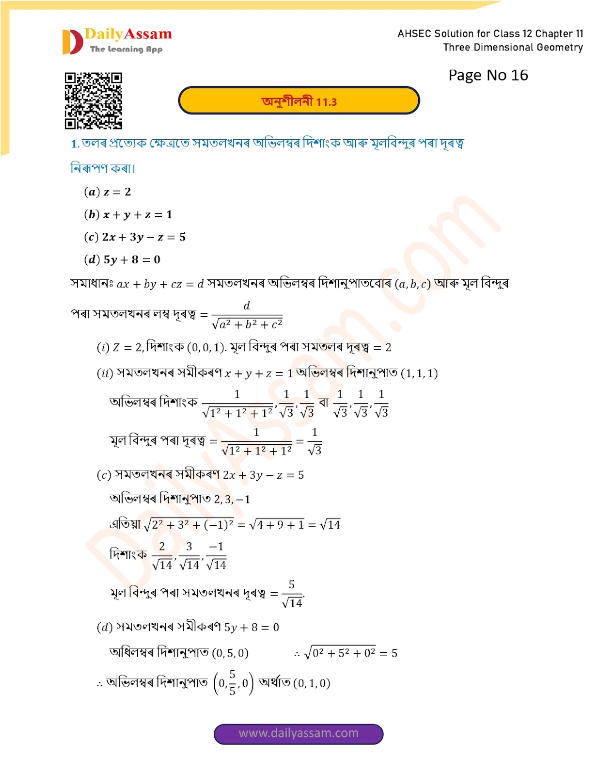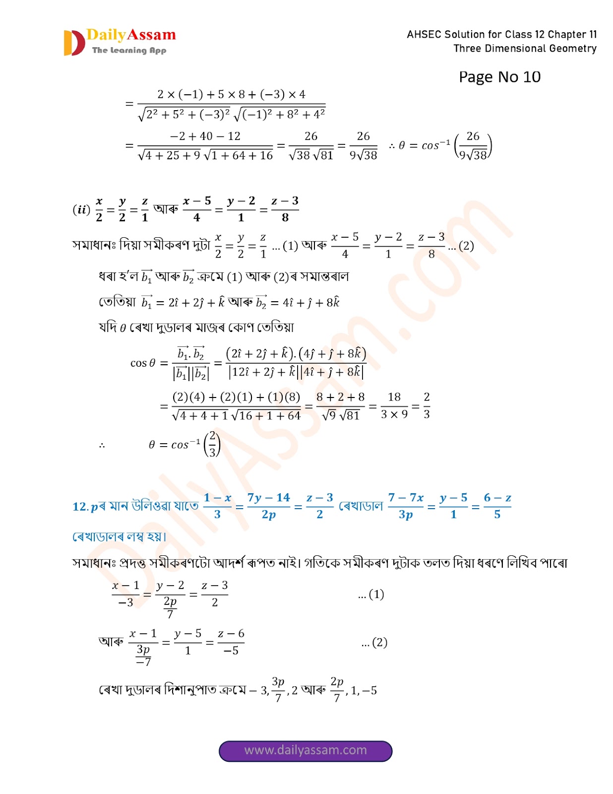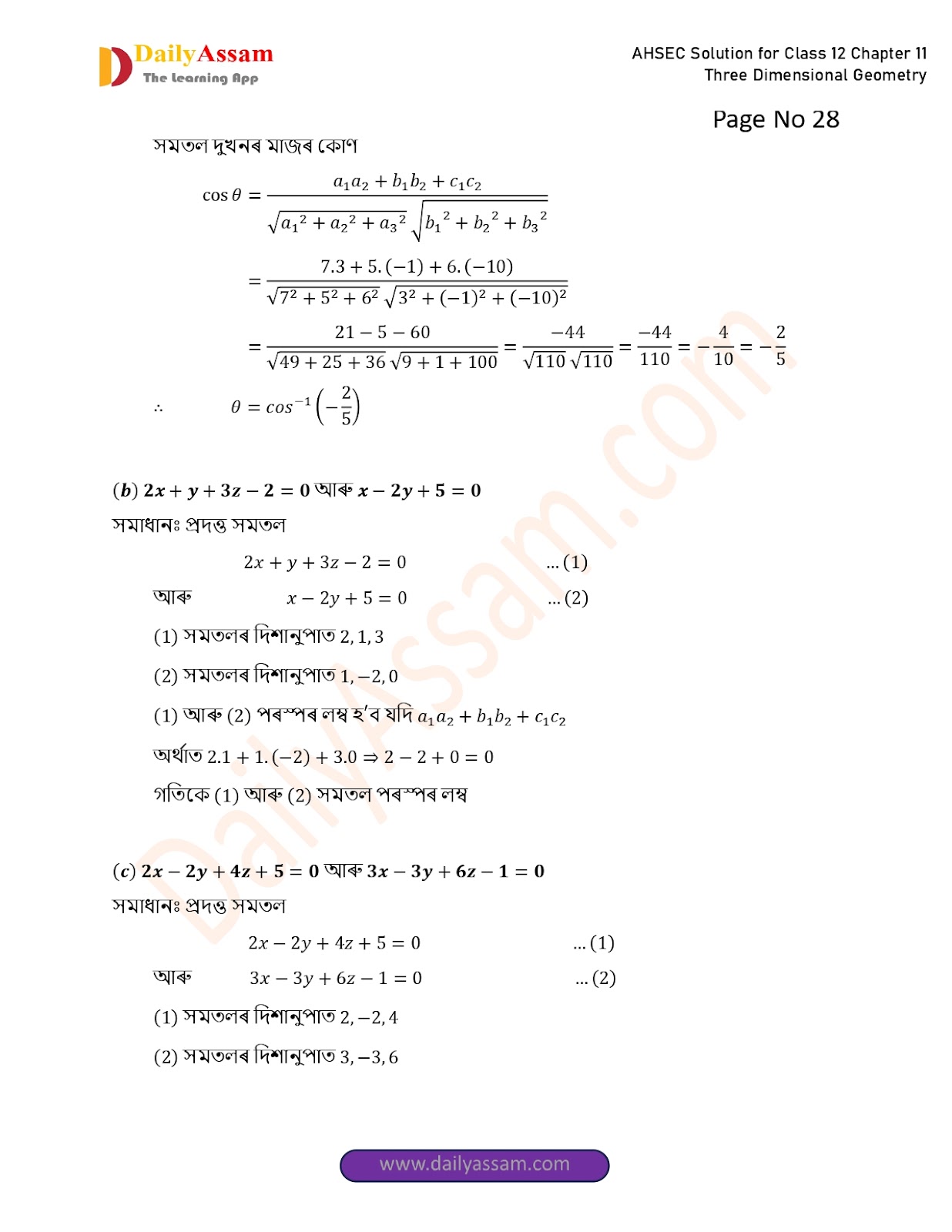 AHSEC Class 12 Mathematics Part 2 Chapter 11 Solution | Assam Board Class 12 Mathematics Part 2 Chapter 11 ত্ৰিবিমিতীয় জ্য়ামিতি (Three Dimensional Geometry) Answer | 2025 - 2026