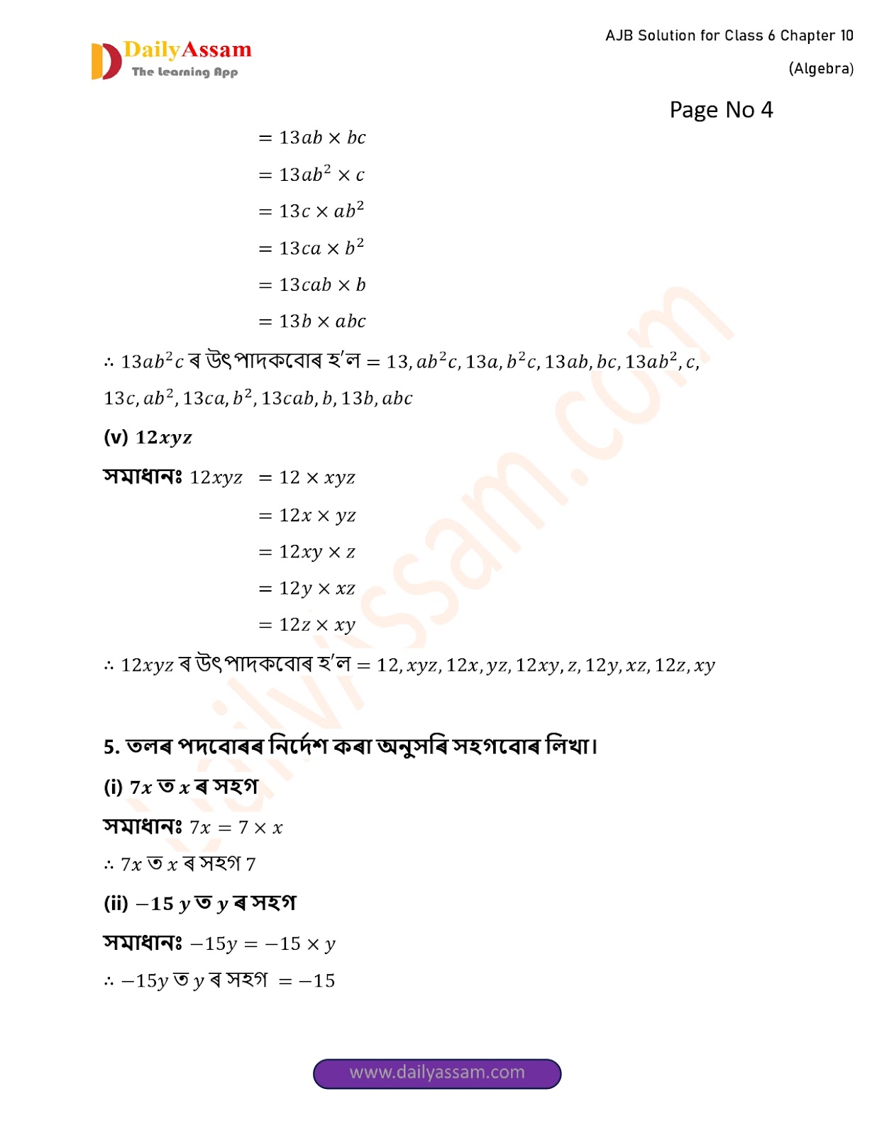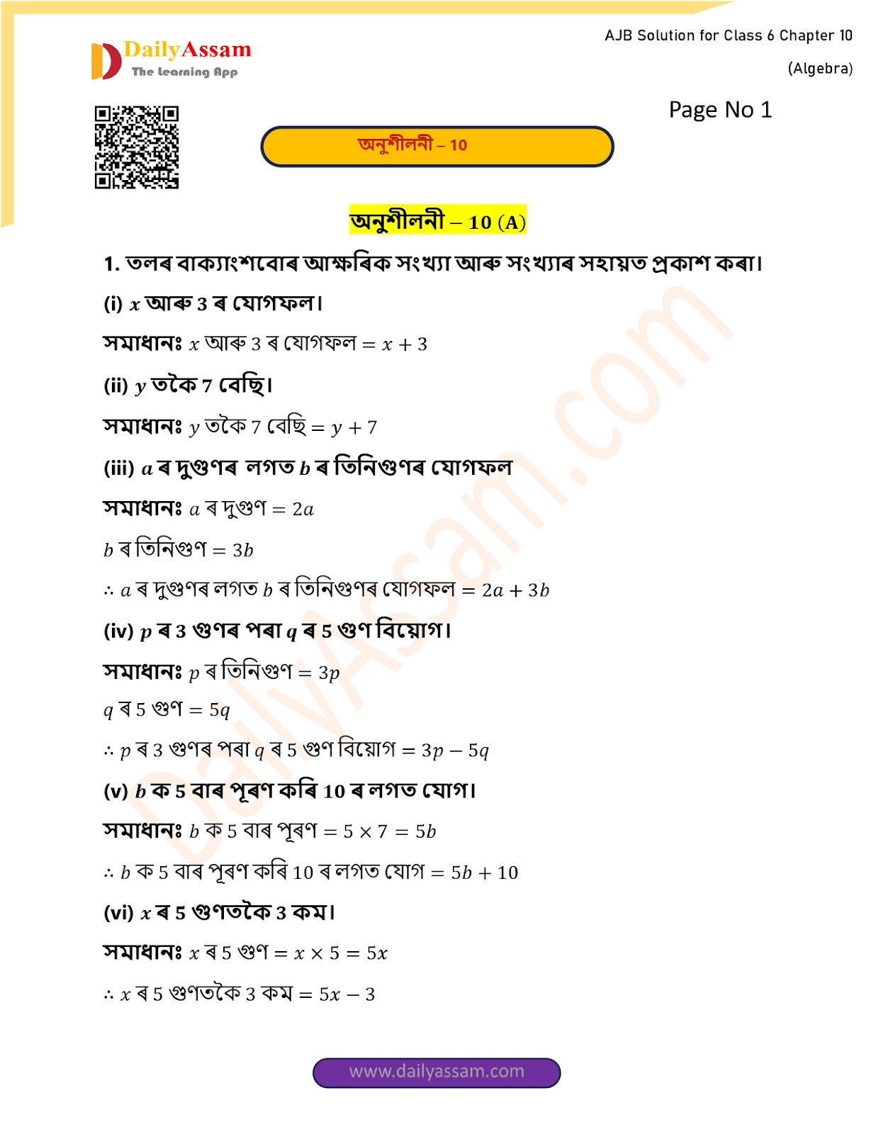 AJB Class 6 Mathematics Chapter 10 Solution | Assam Jatiya Bidyalay Class 6 Mathematics Chapter 10 বীজগণিত (Algebra) Answer | 2025 - 2026