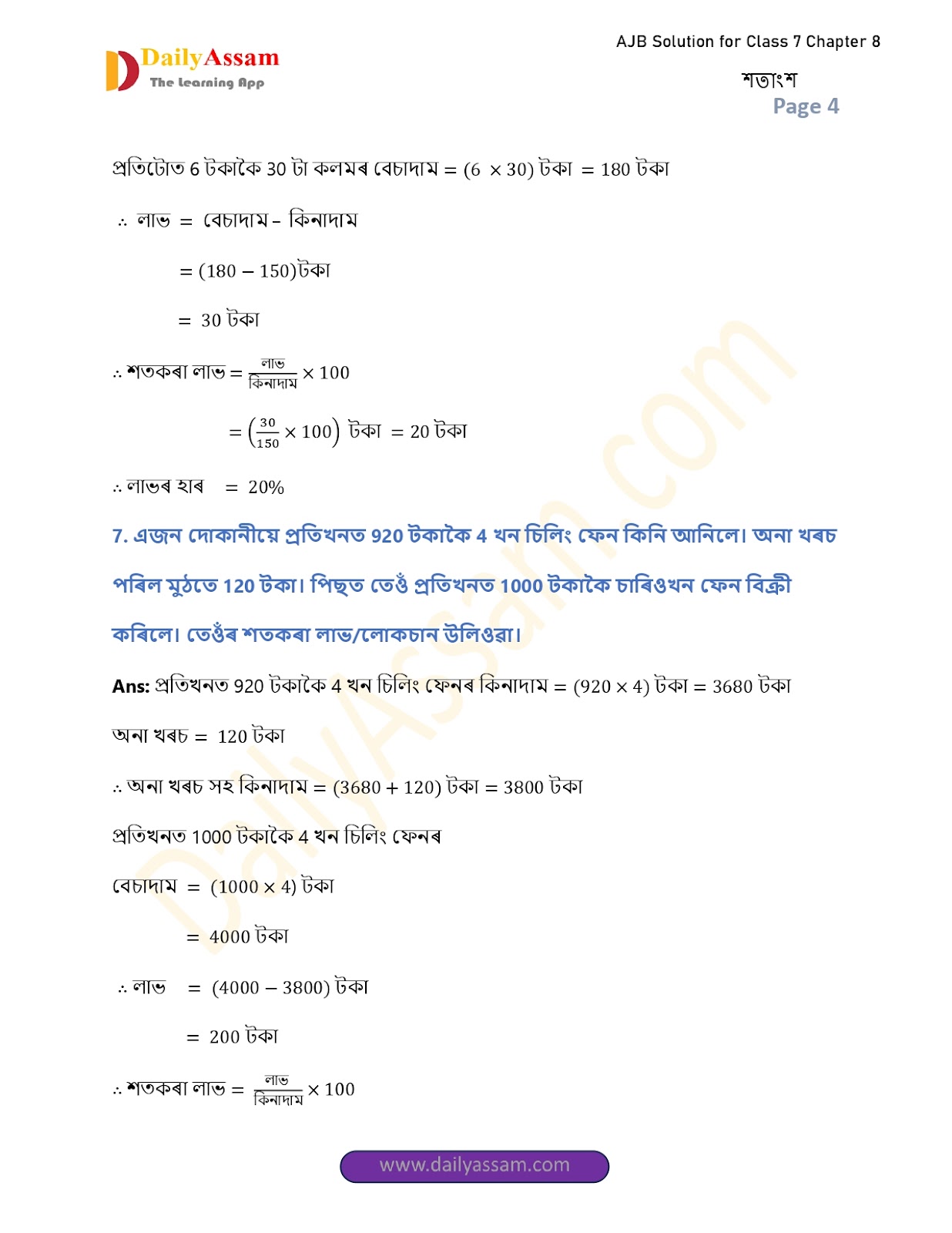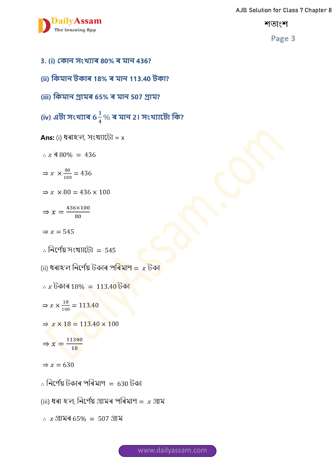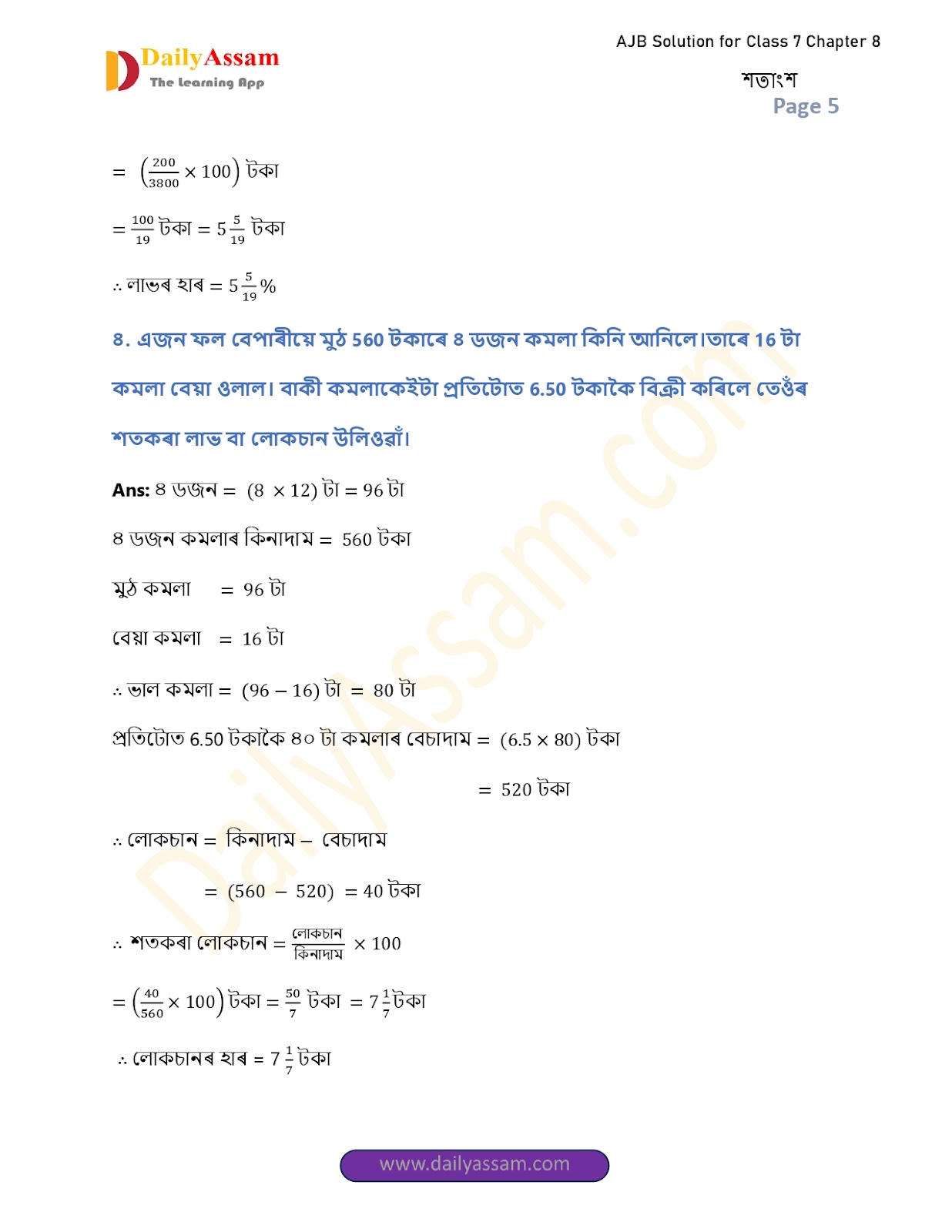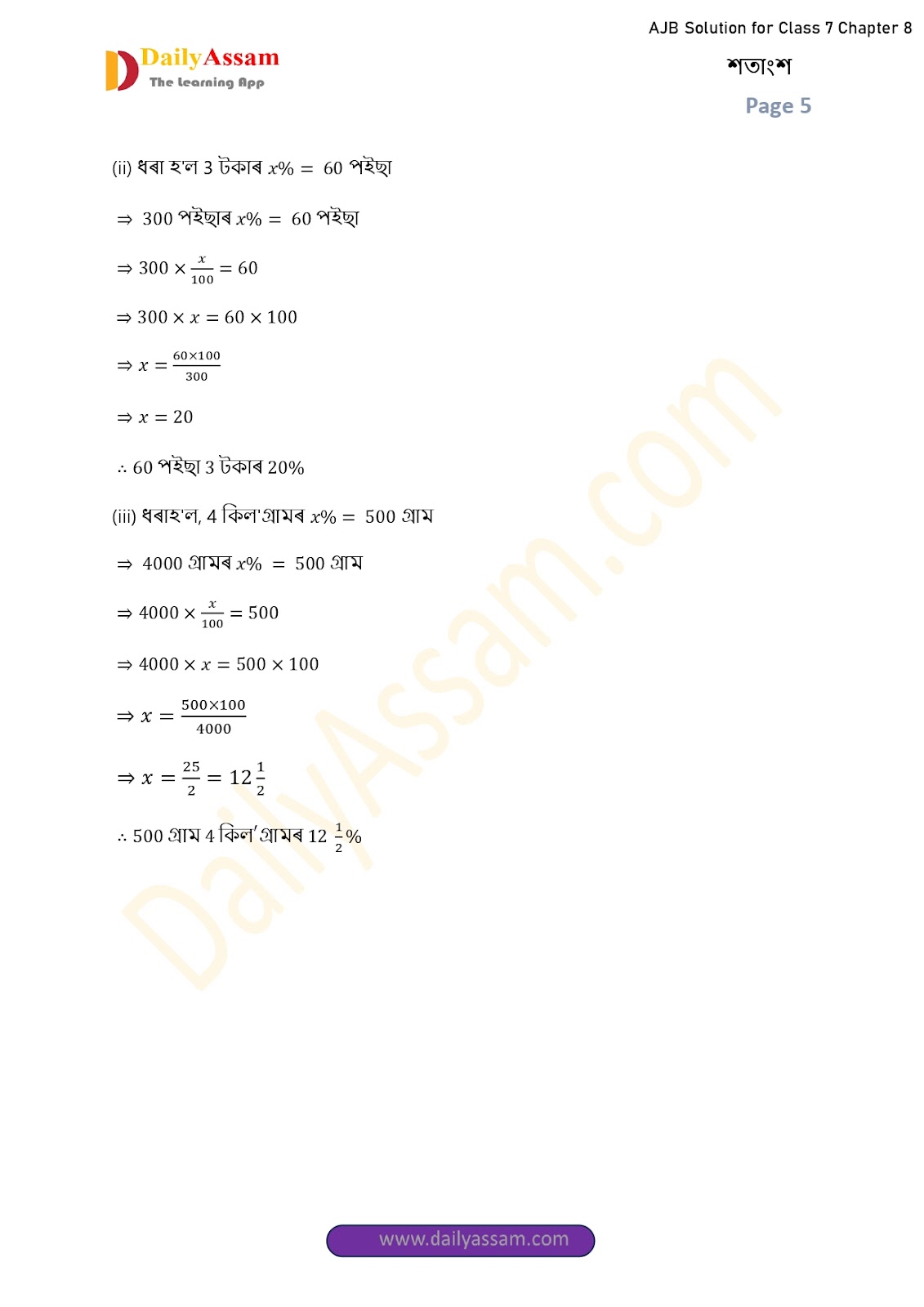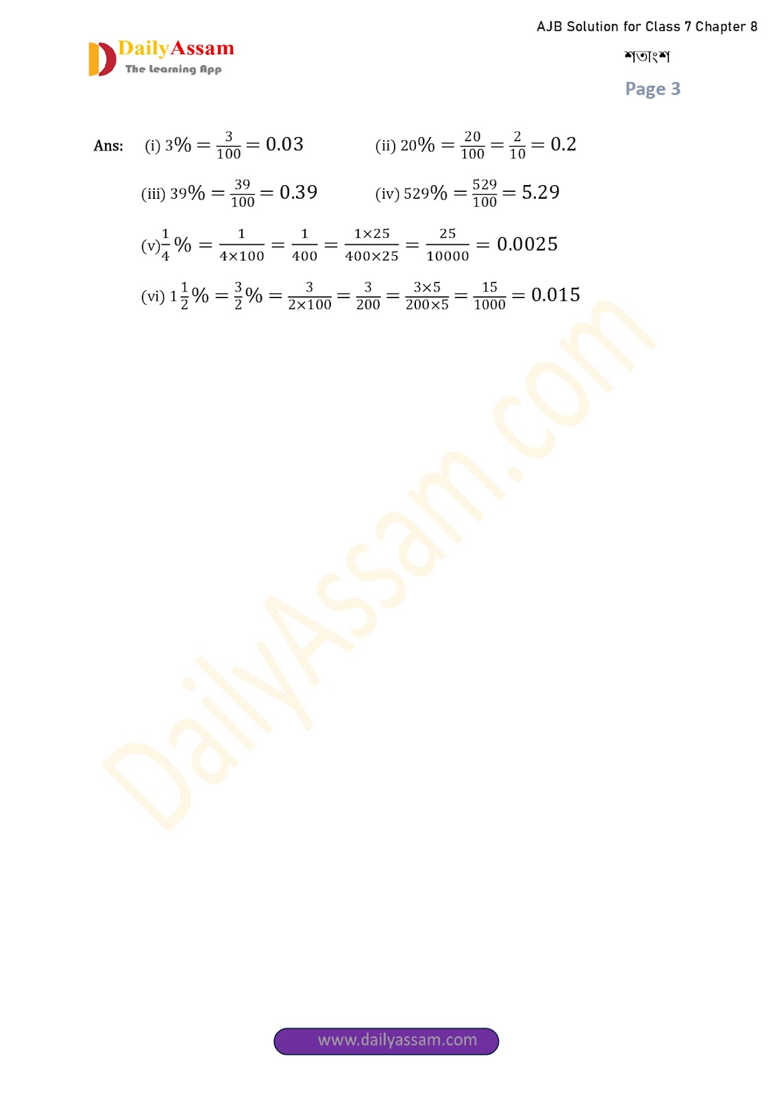 AJB Class 7 Mathematics Chapter 8 Solution | Assam Jatiya Bidyalay Class 7 Mathematics Chapter 8 শতাংশ (Percentage) Answer | 2025 - 2026