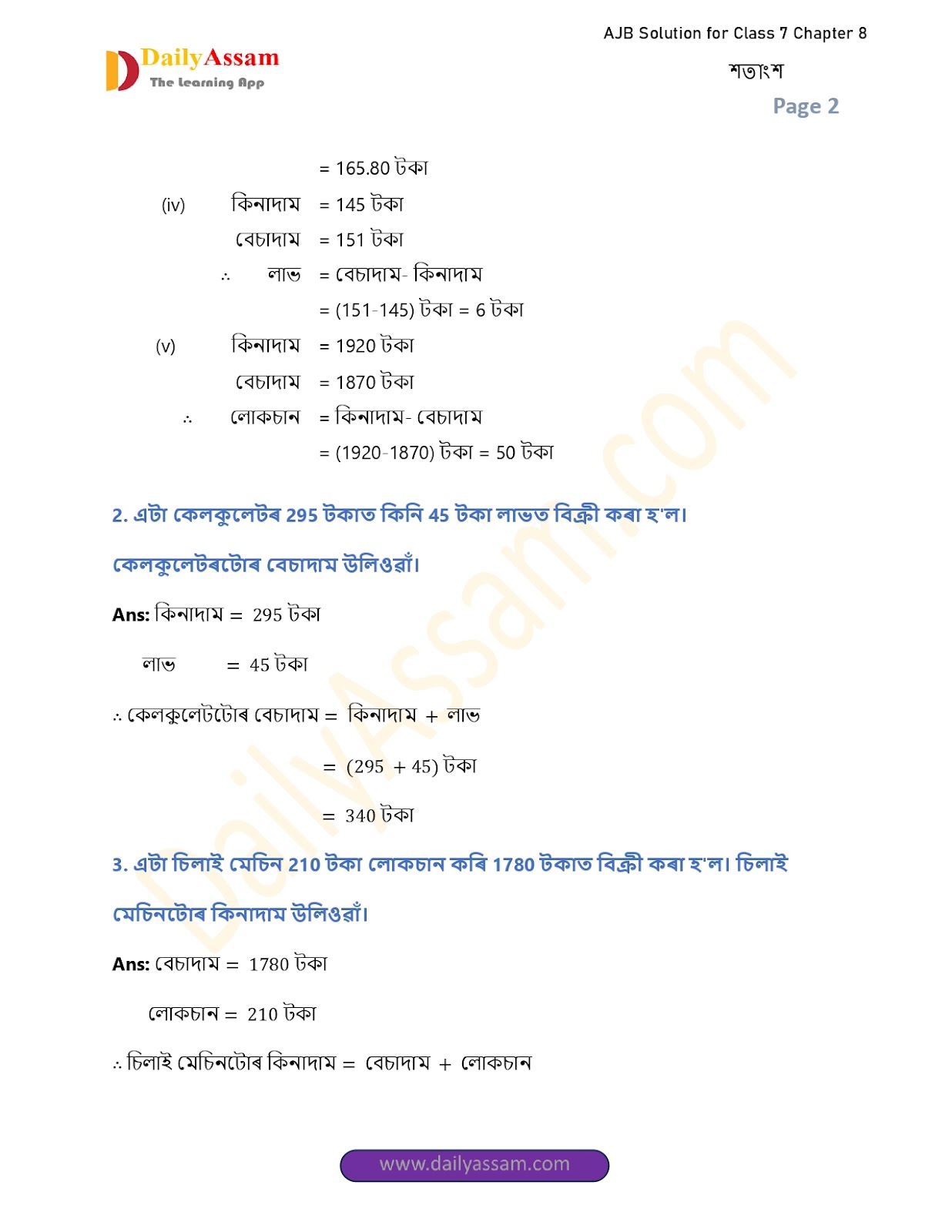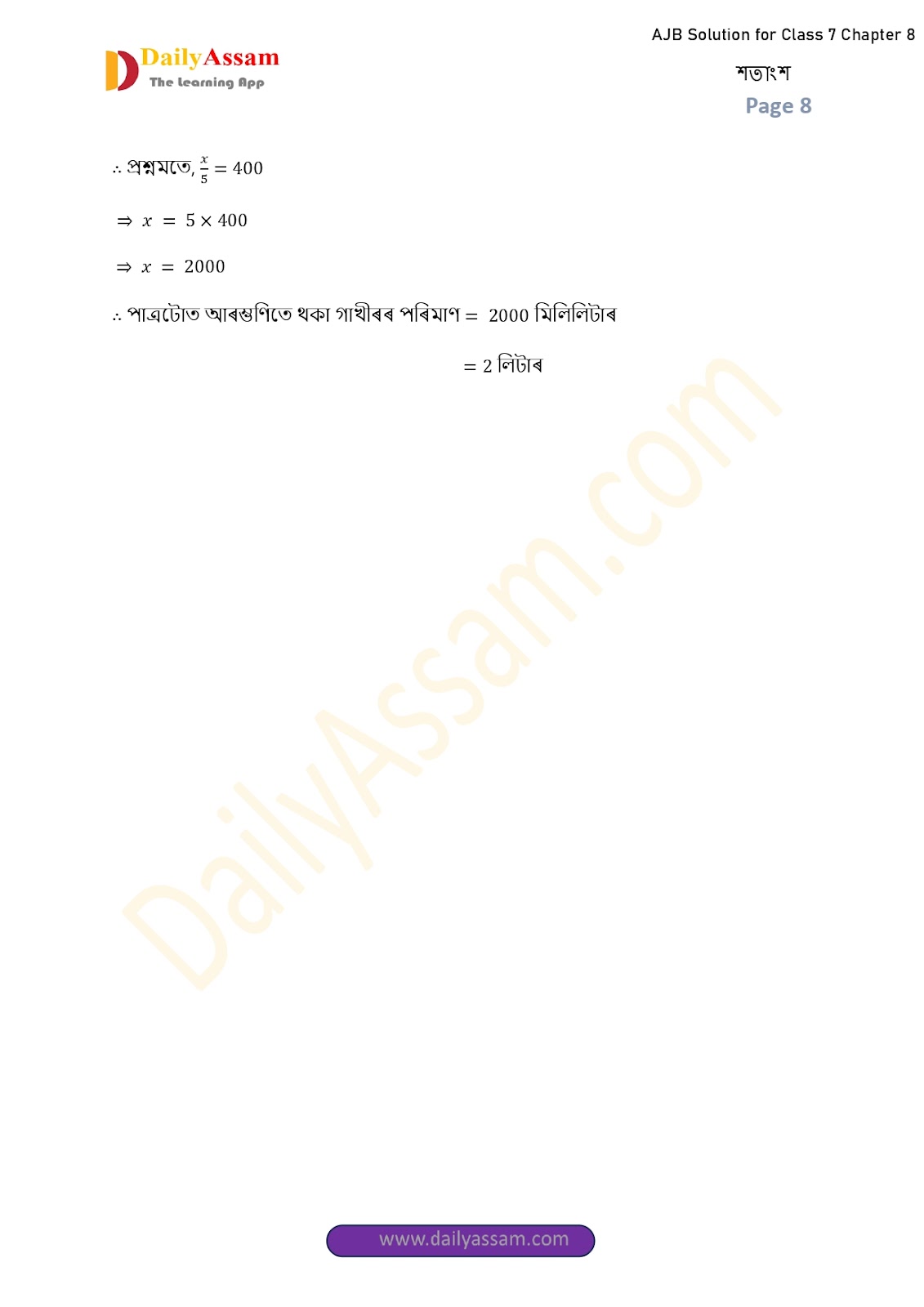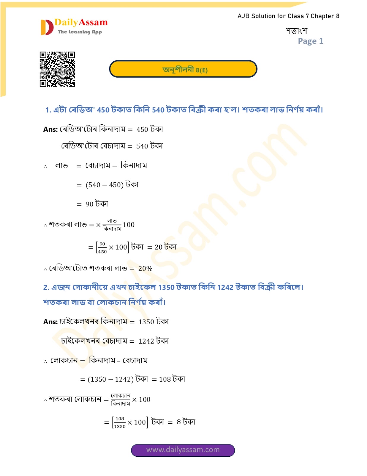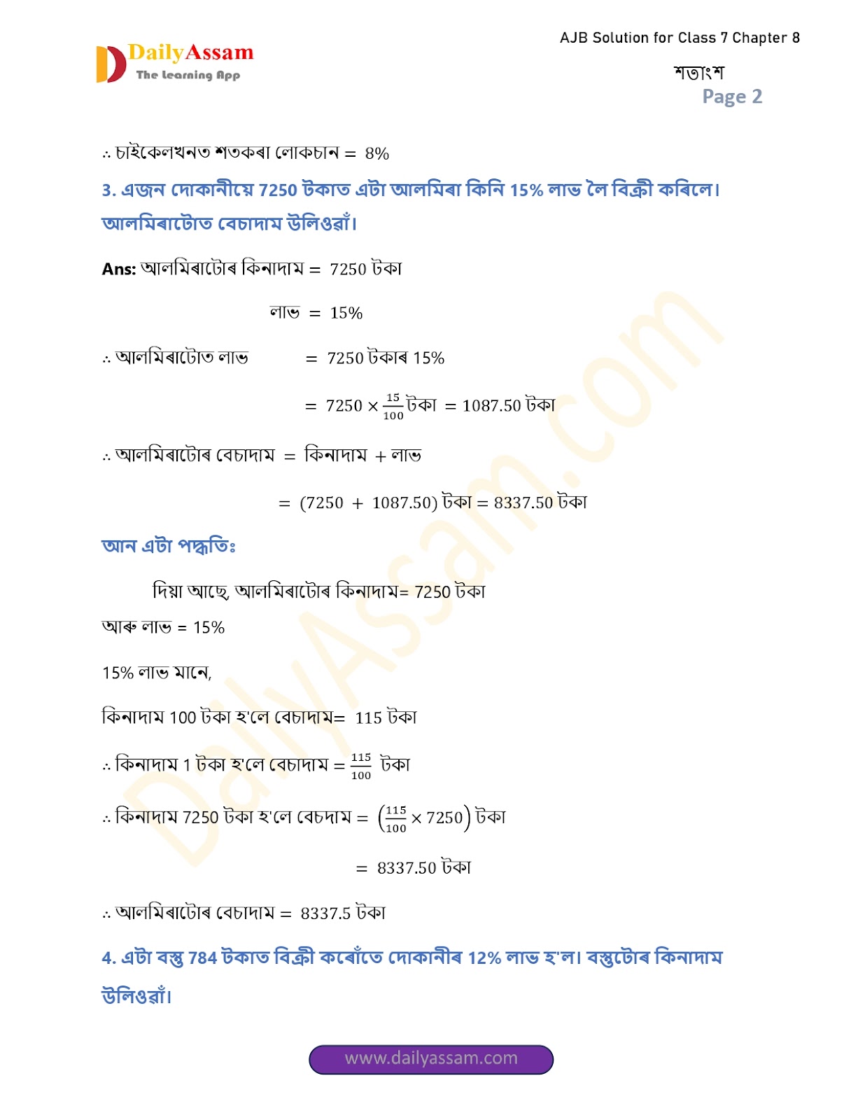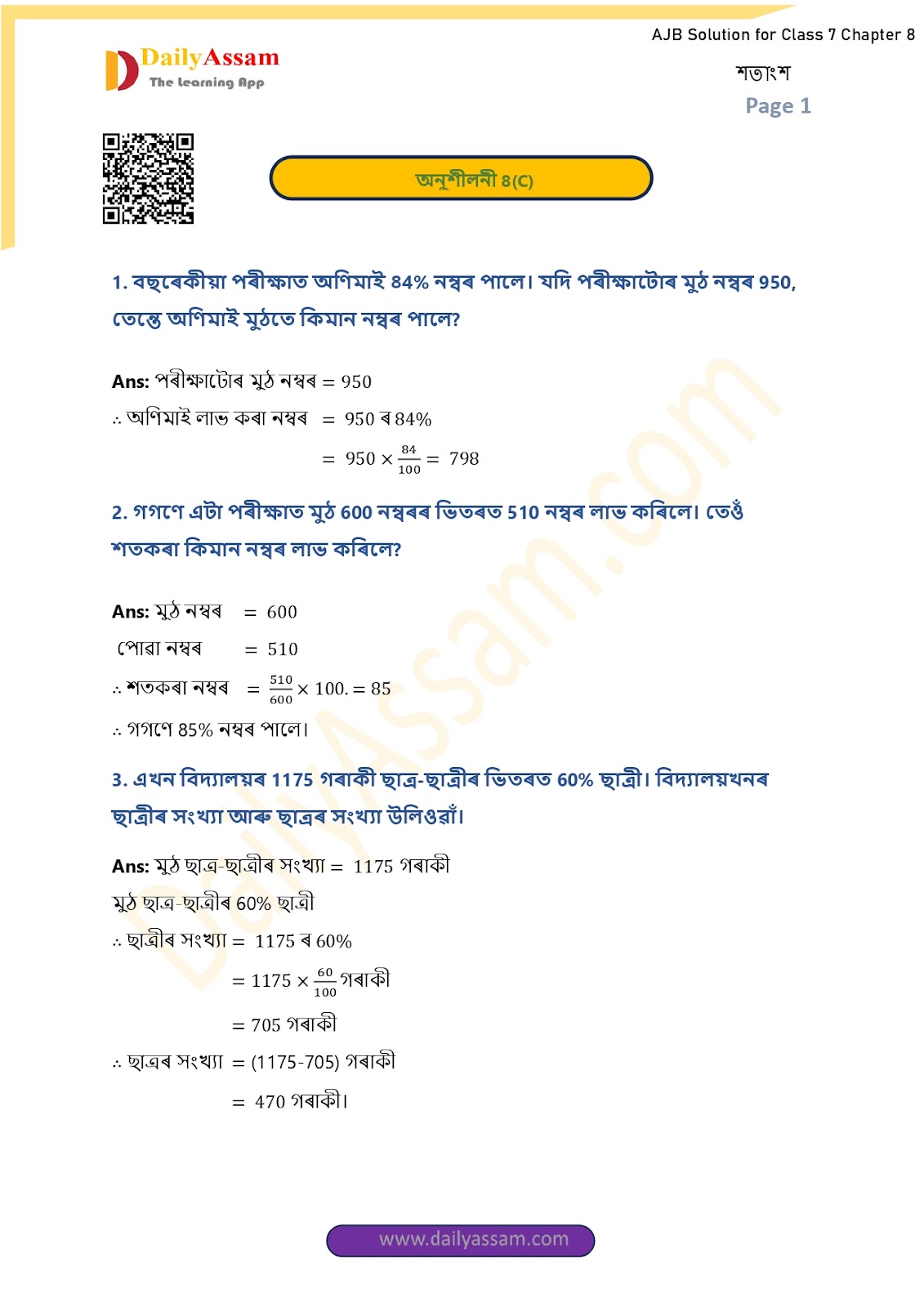 AJB Class 7 Mathematics Chapter 8 Solution | Assam Jatiya Bidyalay Class 7 Mathematics Chapter 8 শতাংশ (Percentage) Answer | 2025 - 2026