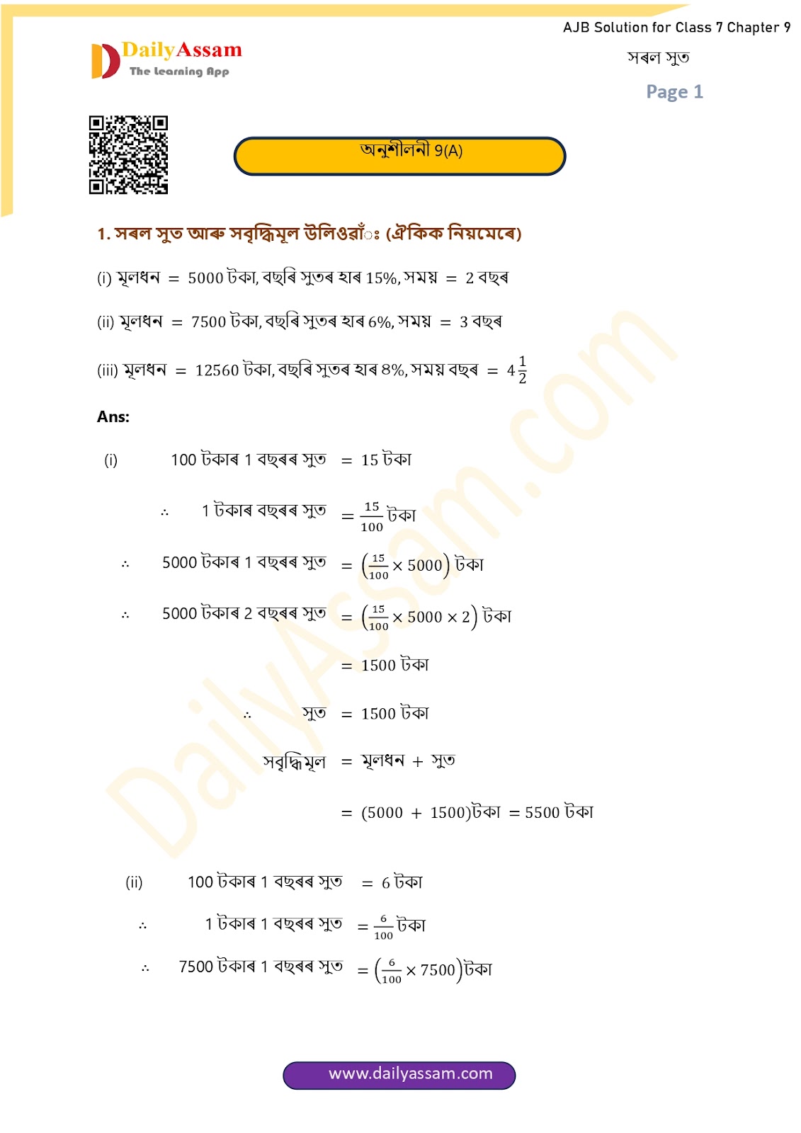HomeAJB Class 7 MathsAJB Class7 Mathematics Chapter 9 Solution | Assam Jatiya Bidyalay Class 7 Mathematics Chapter 9 সৰল সুত (Simple interest) Answer | 2025 - 2026
