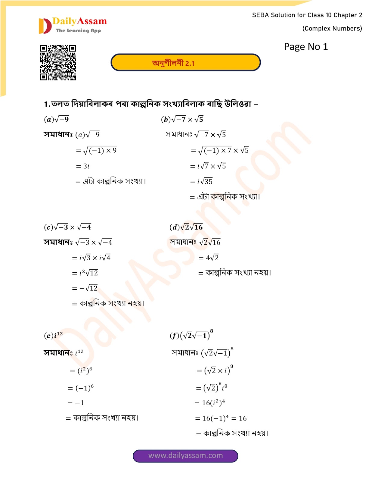 SEBA Class 10 Advanced Mathematics Chapter 2 Solution | Assam Board Class 10 Advanced Mathematics Chapter 2 জটিল সংখ্য়া (Complex numbers) Answer | 2025 -2026