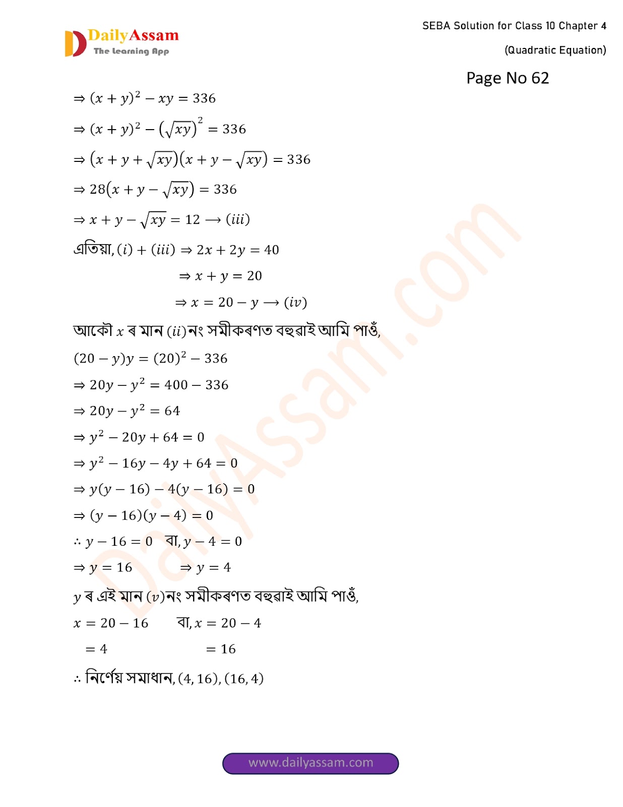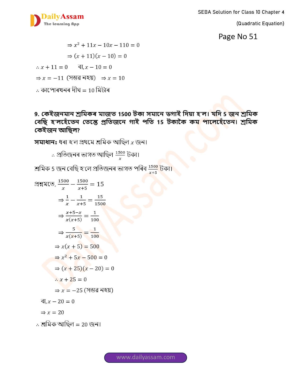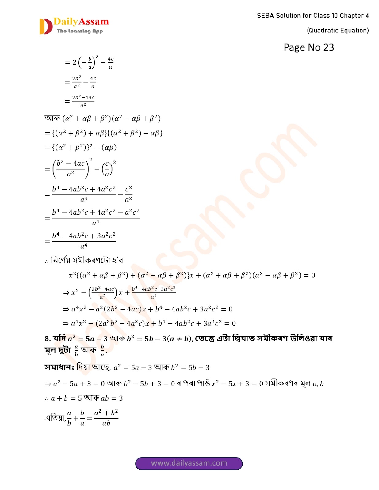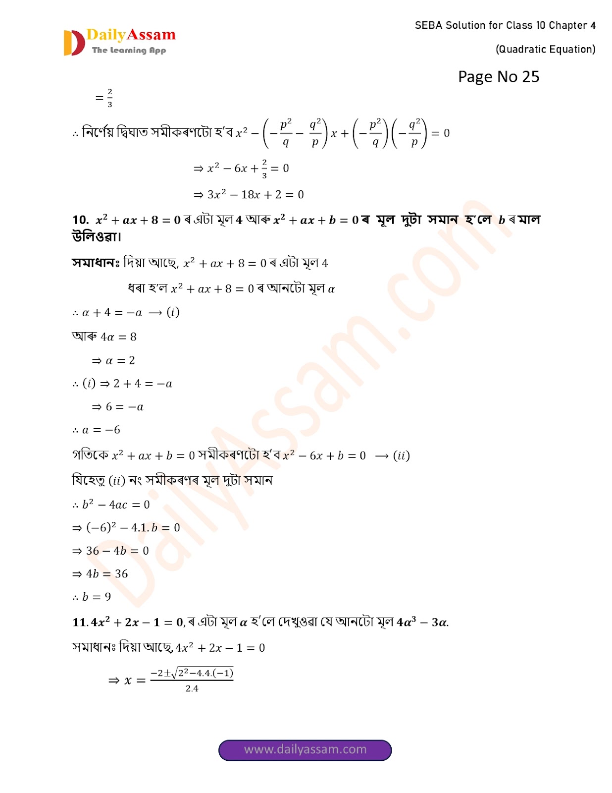 SEBA Class 10 Advanced Mathematics Chapter 4 Solution | Assam Board Class 10 Advanced Mathematics Chapter 4 দ্বিঘাত সমীকৰণ (Quadratic equations) Answer | 2025 -2026