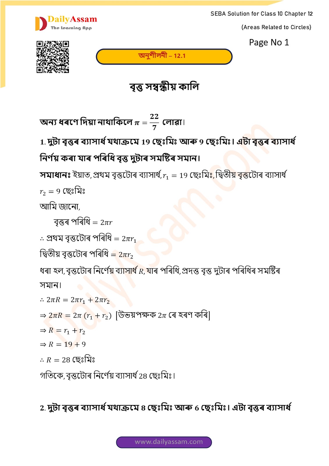 SEBA Class 10 Mathematics Chapter 12 Solution | Assam Board Class 10 Mathematics Chapter 12 বৃত্ত সমন্ধীয় কালি (Circular time) Answer | 2025 - 2026