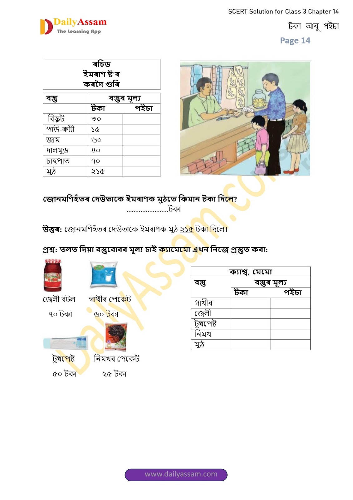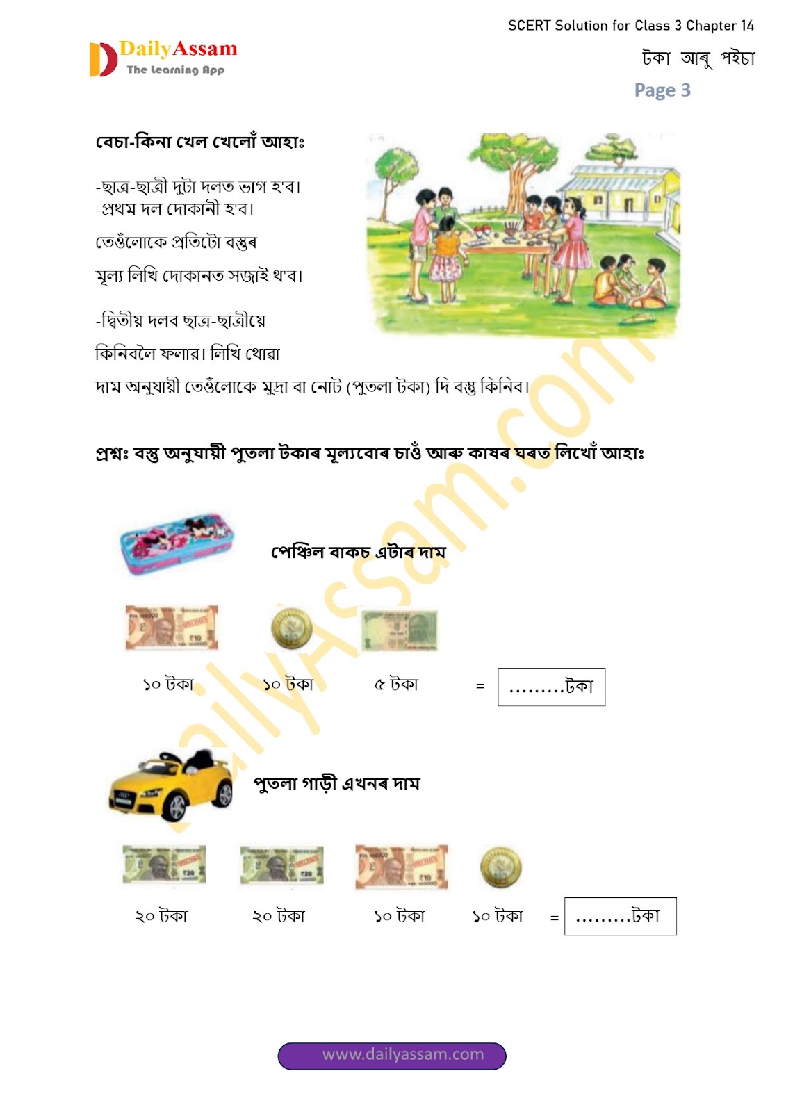 SEBA Class 3 Mathematics Chapter 14 Solution | Assam Board Class 3 Mathematics Chapter 14 টকা-পইচা (Money and money) Answer | 2025 -2026