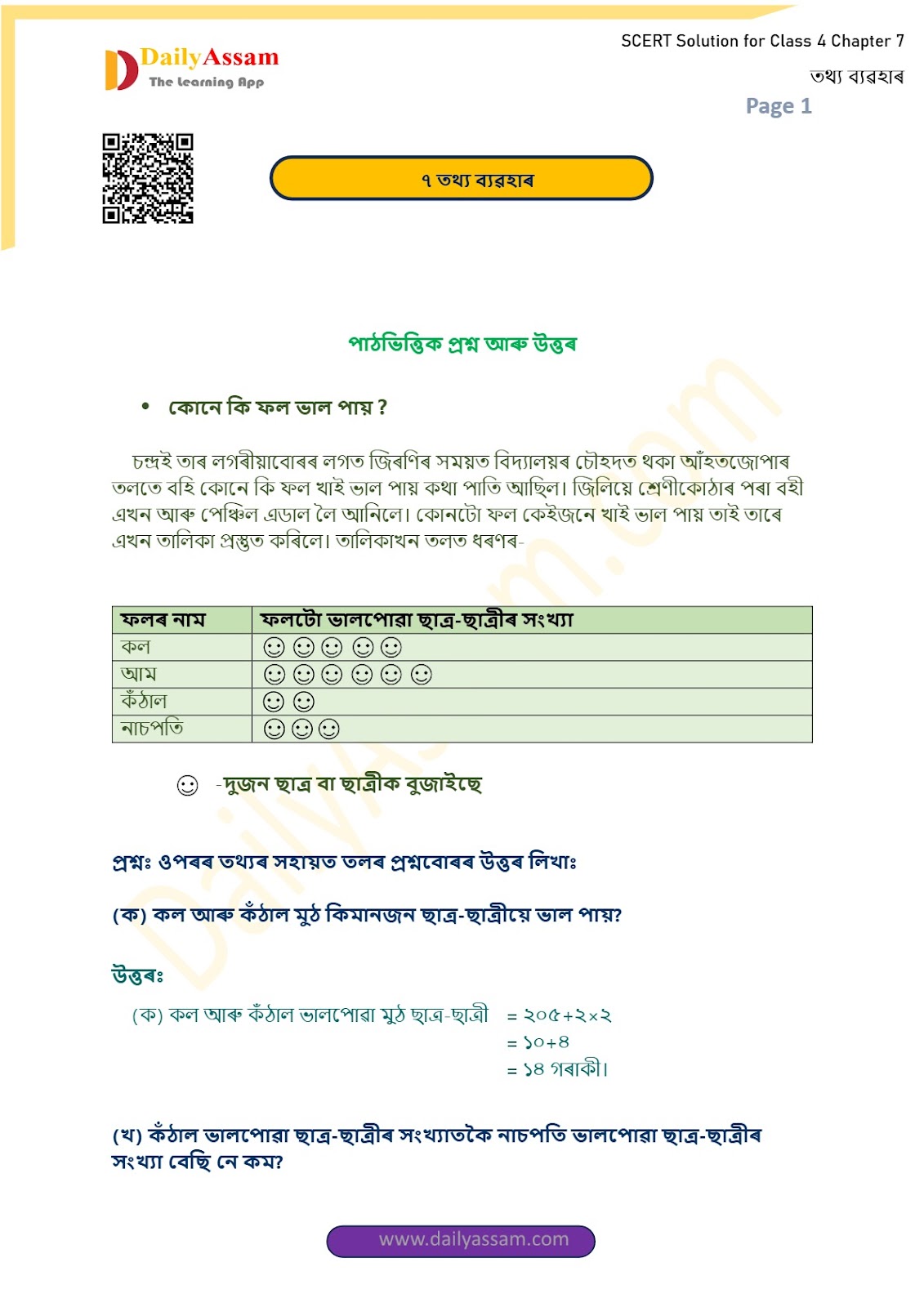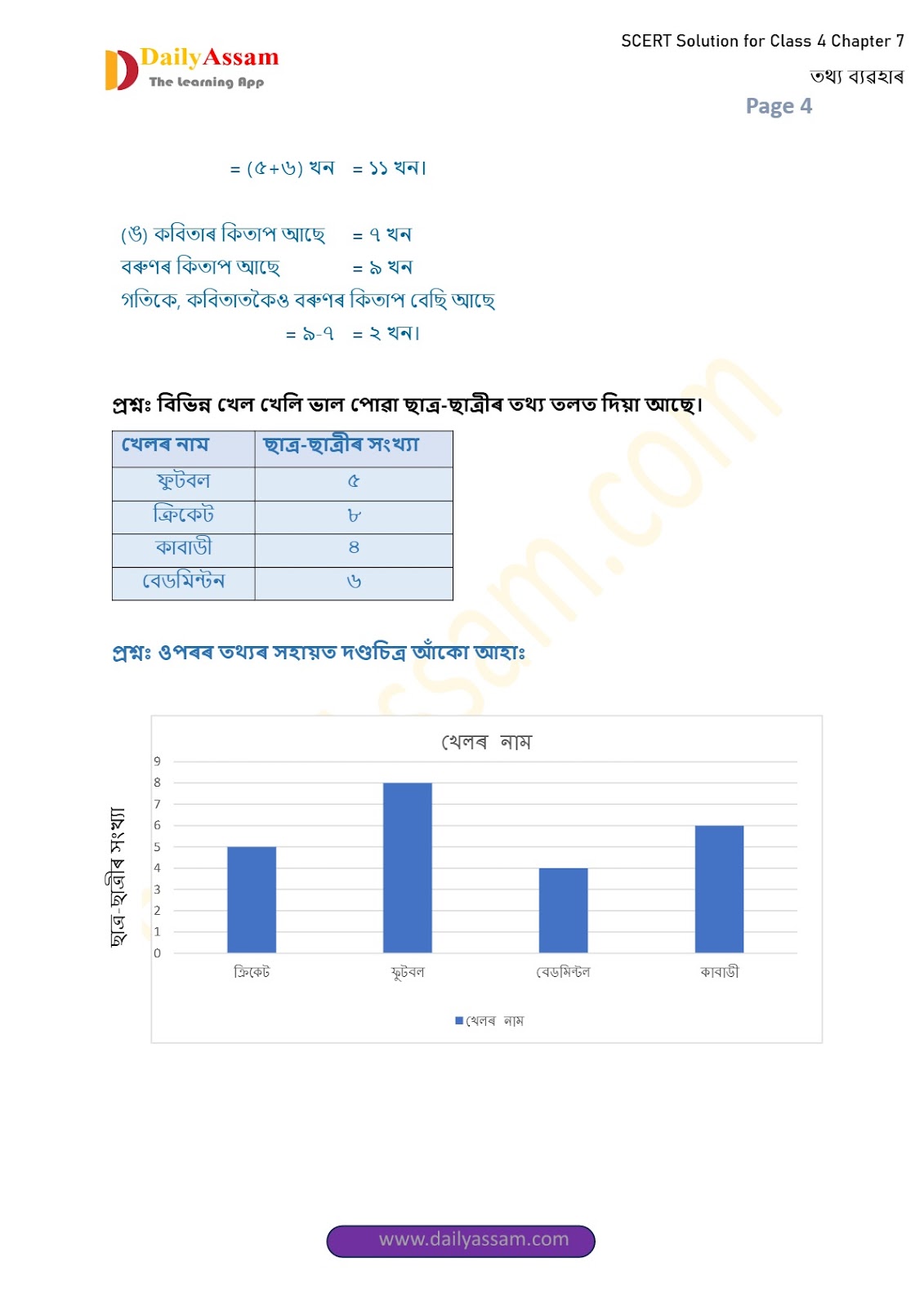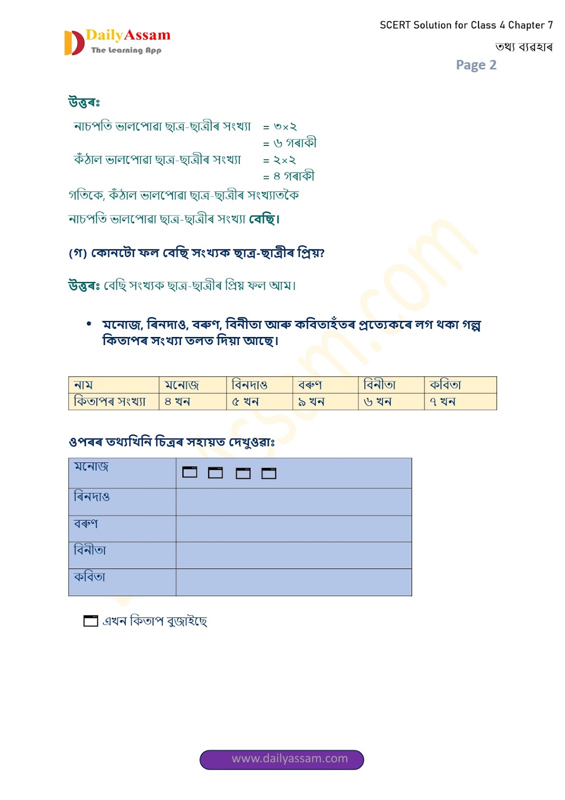 SEBA Class 4 Mathematics Chapter 7 Solution | Assam Board Class 4 Mathematics Chapter 7 তথ্যৰ ব্যৱহাৰ (Use of Data) Answer | 2025 -2026