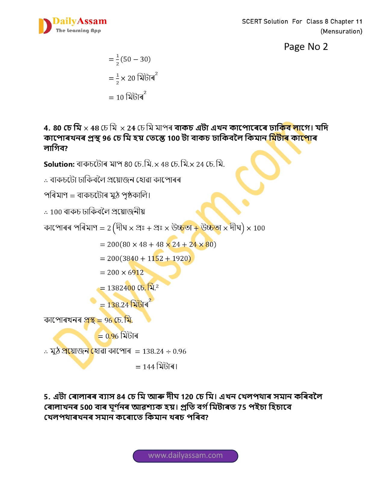 SEBA Class 8 Mathematics Chapter 11 Solution | Assam Board Class 8 Mathematics Chapter 11 পৰিমিতি (Mensuration) Answer |2025-2026