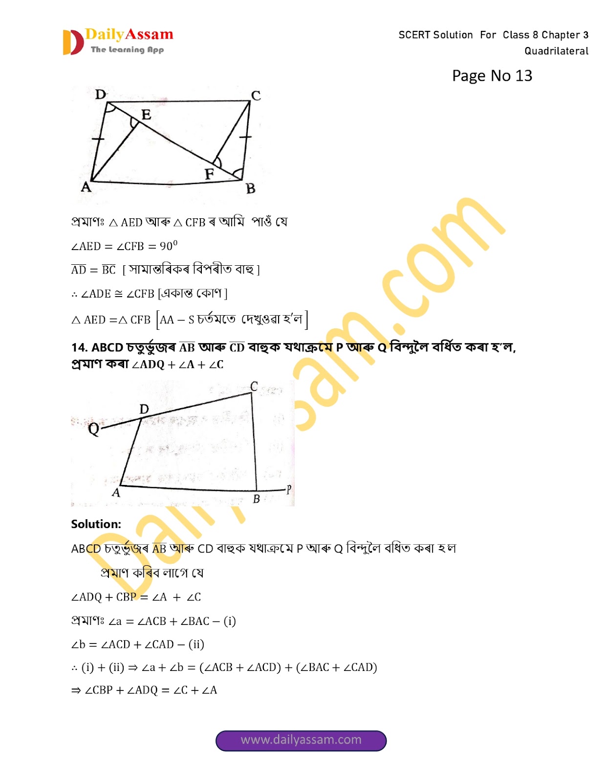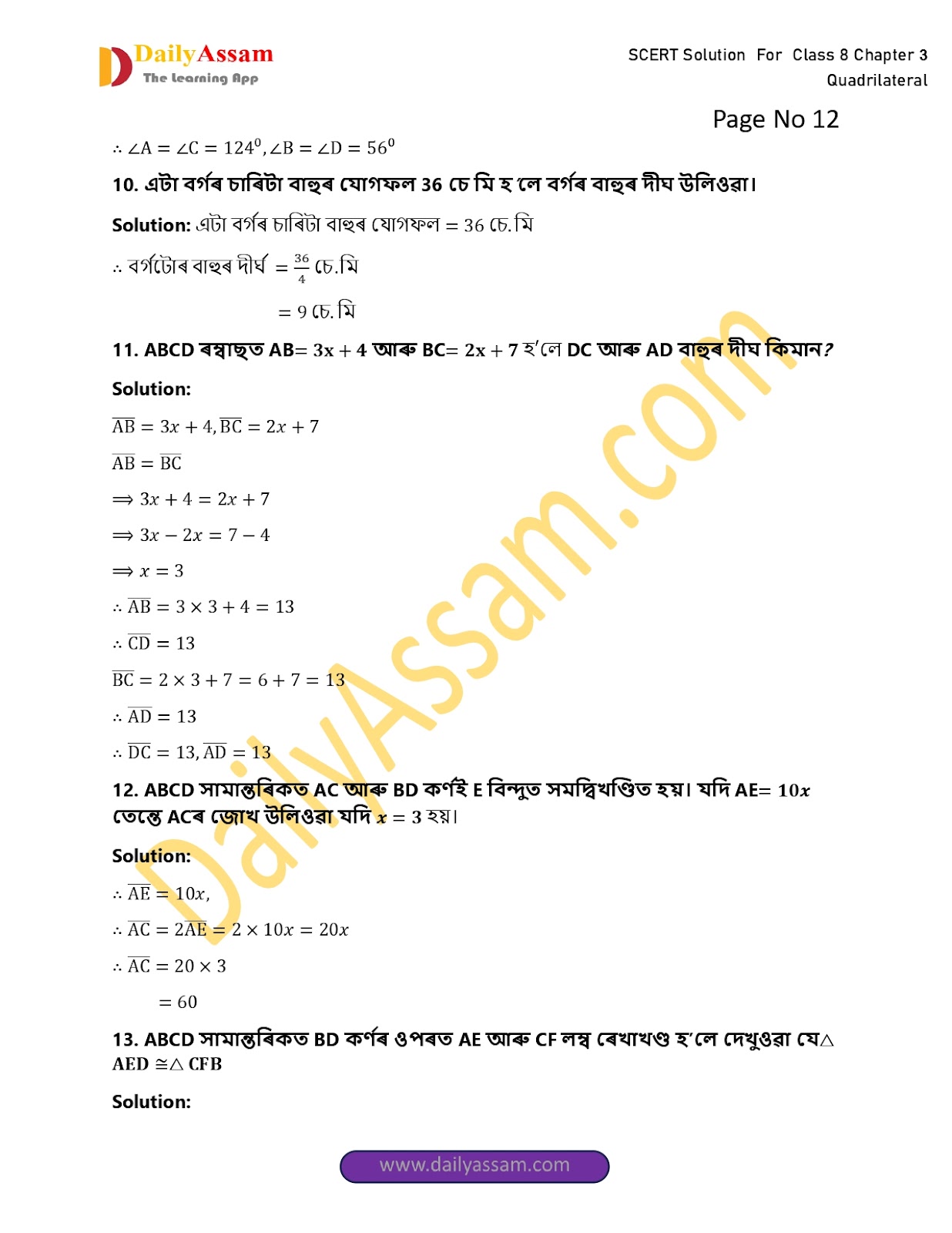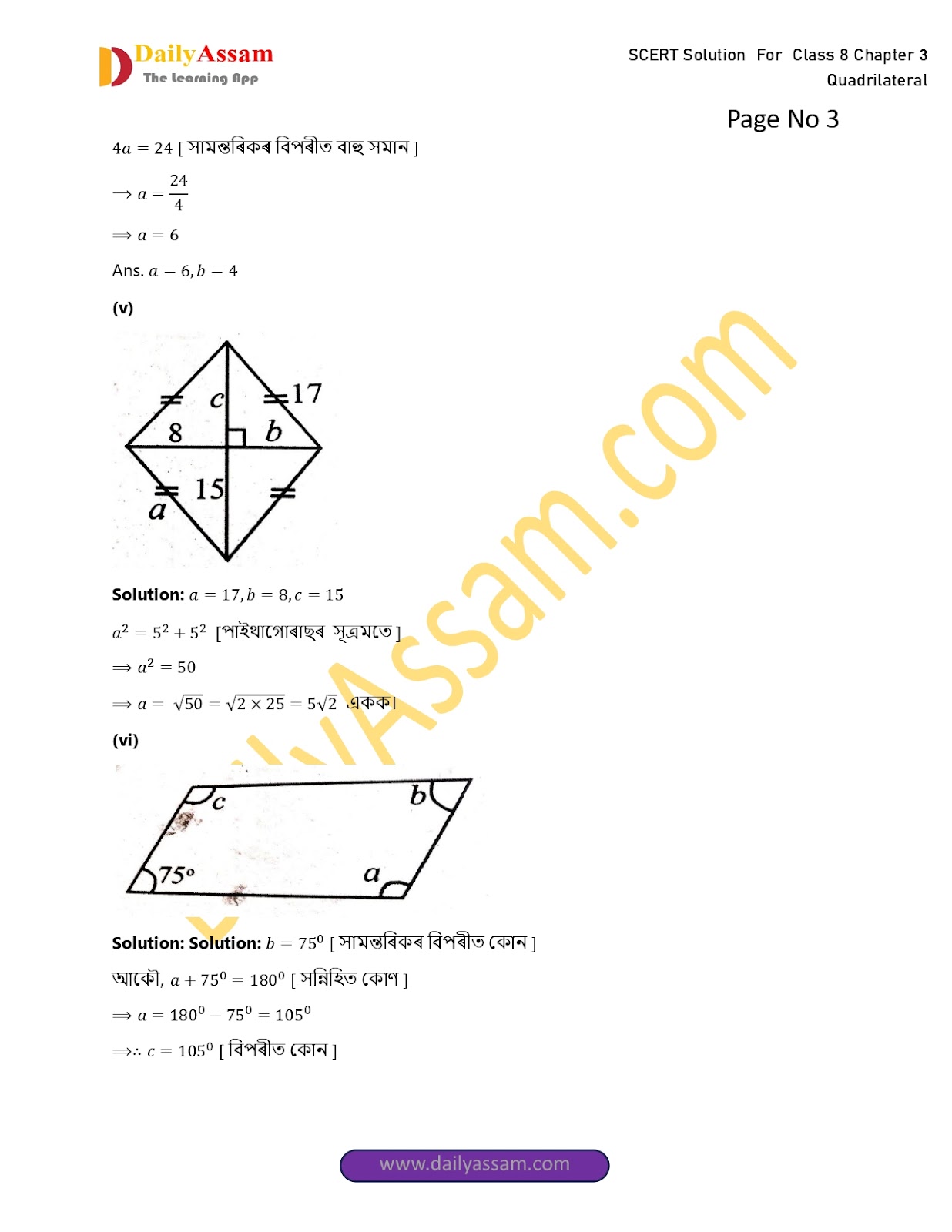 SEBA Class 8 Mathematics Chapter 3 Solution | Assam Board Class 8 Mathematics Chapter 3 চতুৰ্ভুজ (The quadrilateral) Answer | 2025-2026