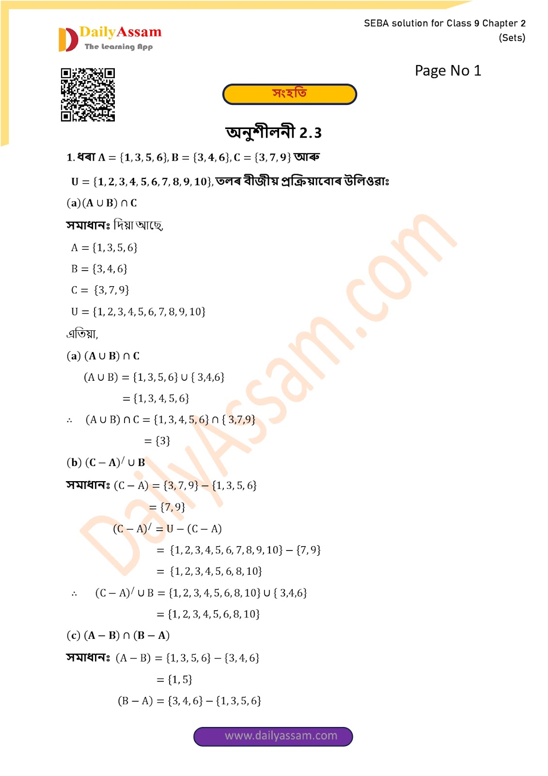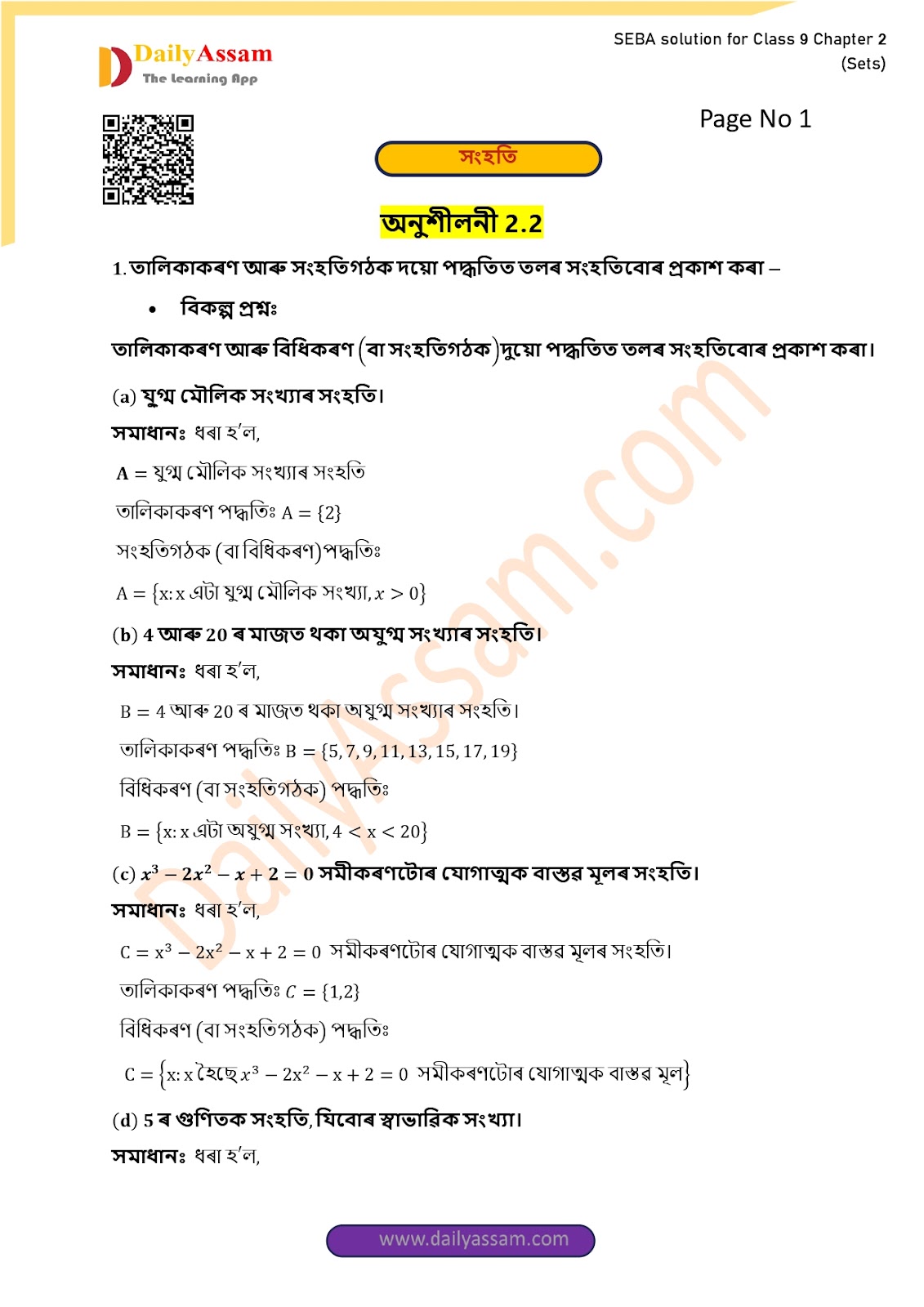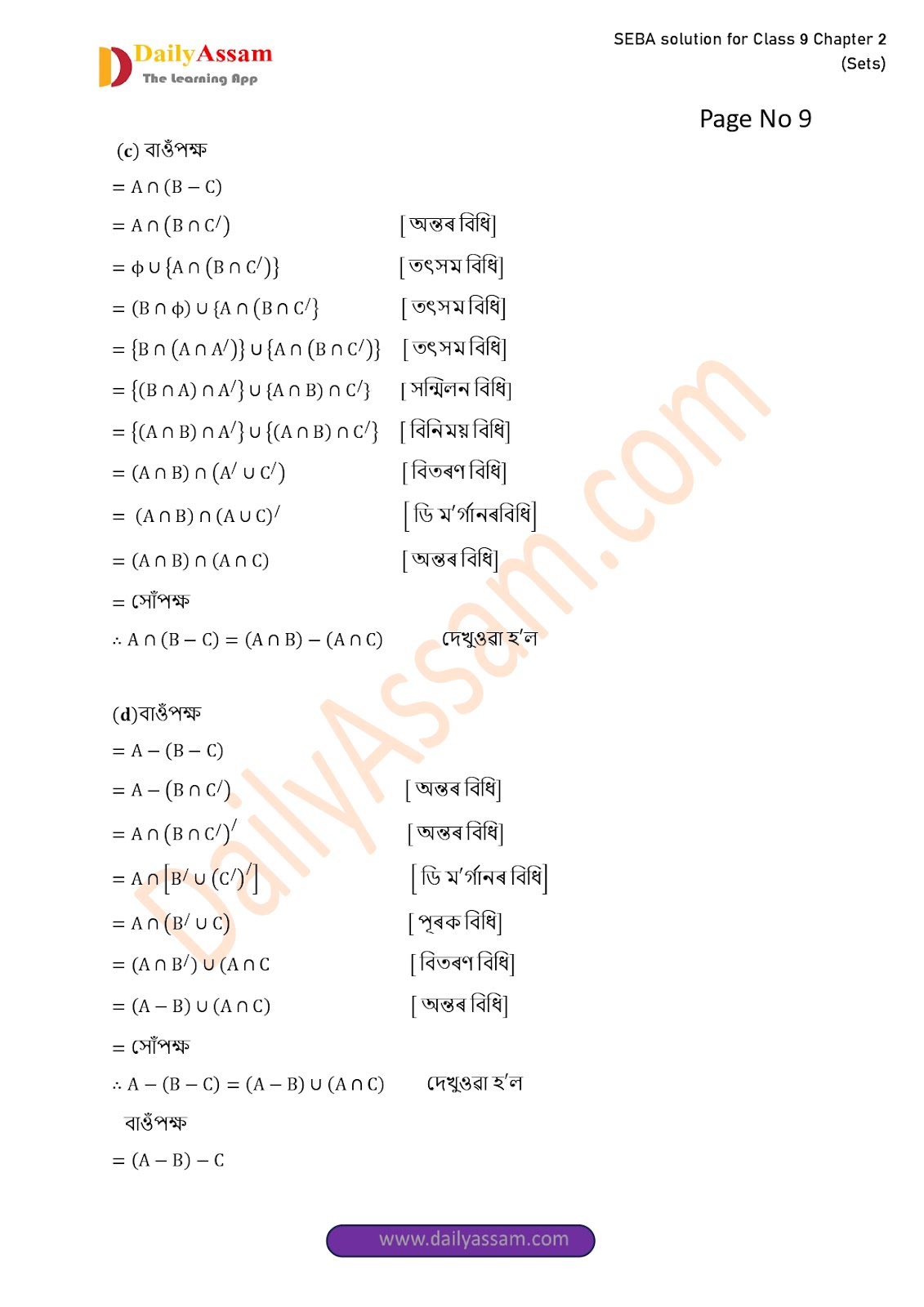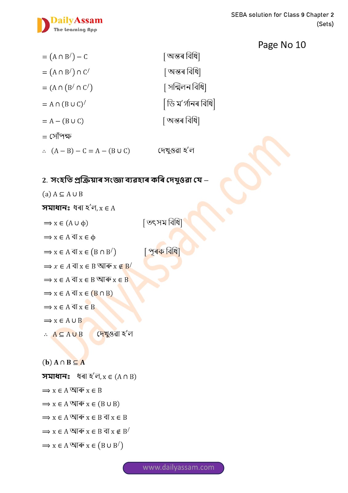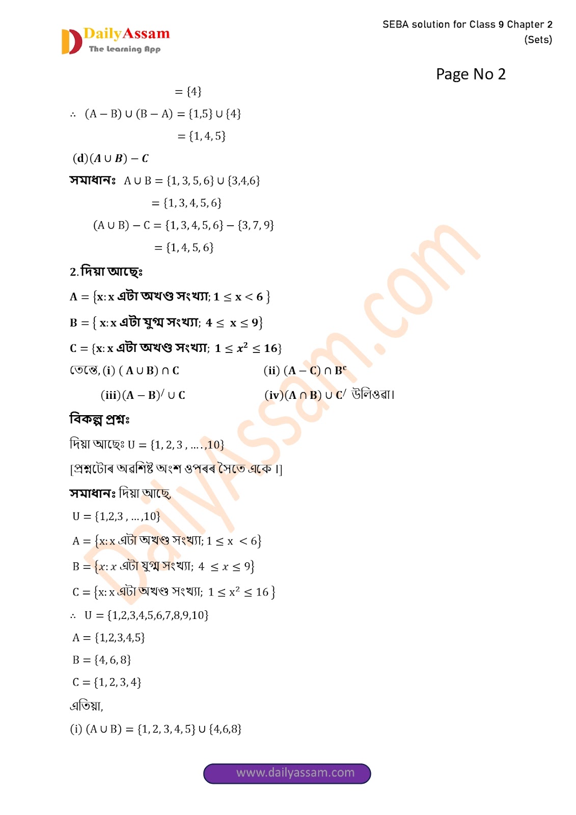 SEBA Class 9 Advanced Mathematics Chapter 2 Solution | Assam Board Class 9 Advanced Mathematics Chapter 2 সংহতি ( Sets) Answer | 2025 -2026