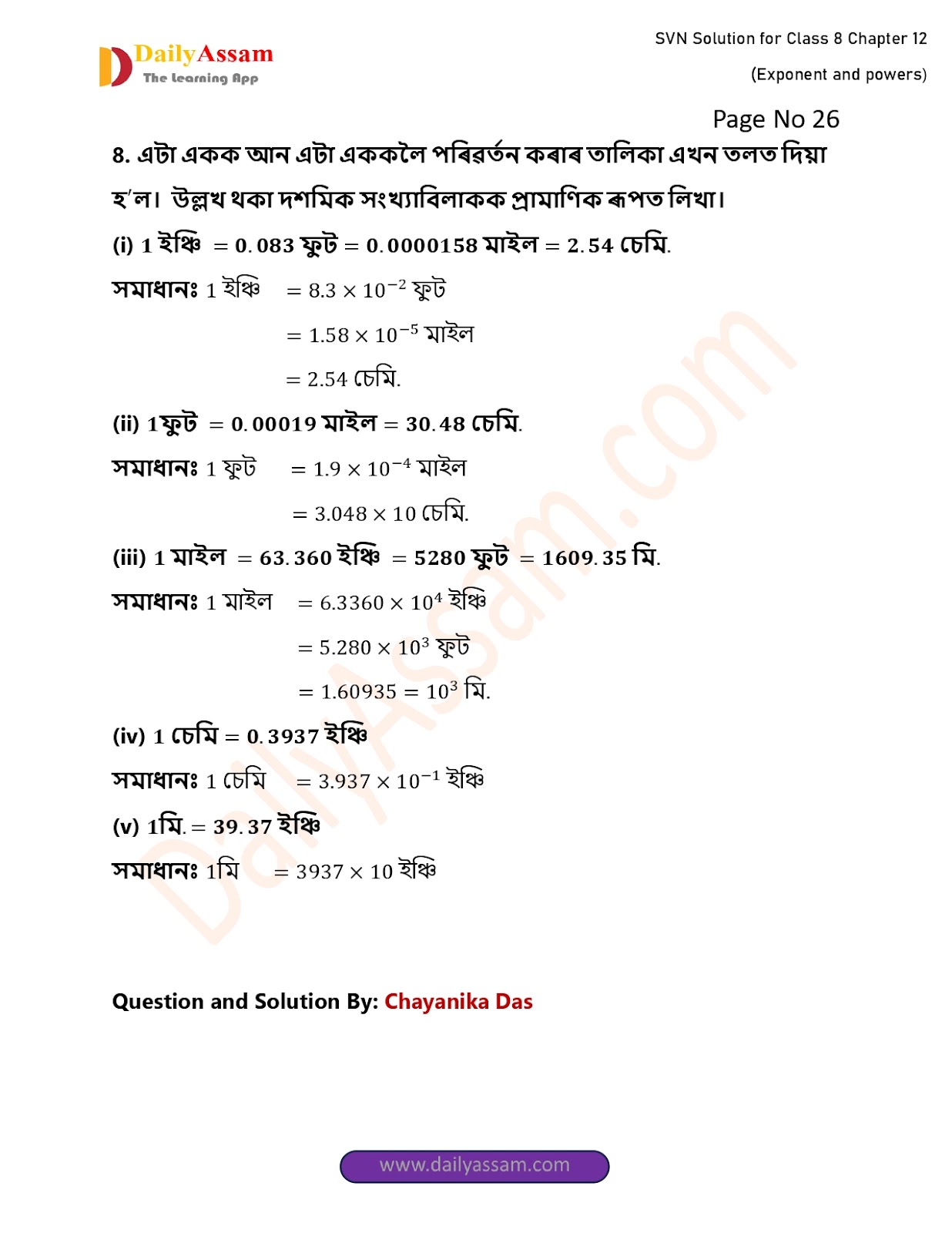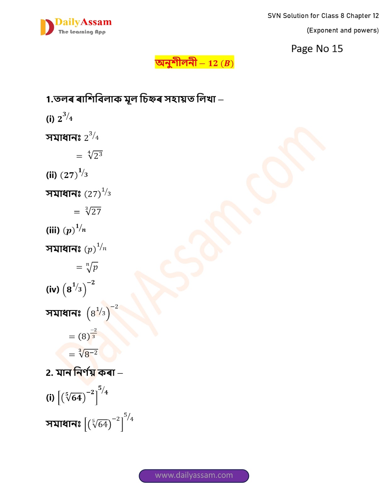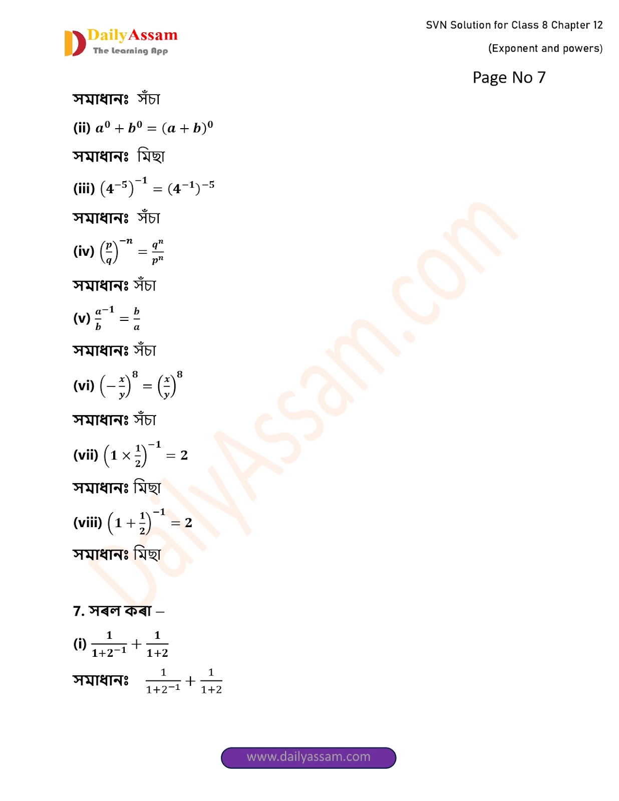 SVN Class 8 Mathematics Chapter 12 Solution | Sankardev Sishu Niketan Class 8 Mathematics Chapter 12 সূচক আৰু ঘাত (Exponents and Exponents) Answer | 2025 - 2026