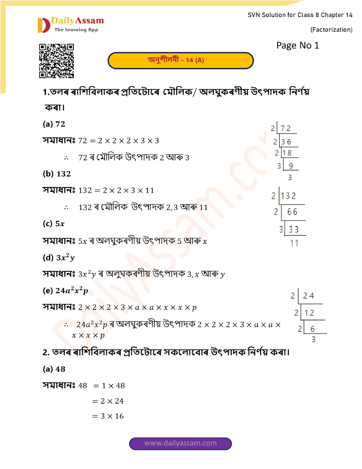 SVN Class 8 Mathematics Chapter 14 Solution | Sankardev Sishu Niketan Class 8 Mathematics Chapter 14 উৎপাদক বিশ্লেষণ (Producer analysis) Answer | 2025 - 2026
