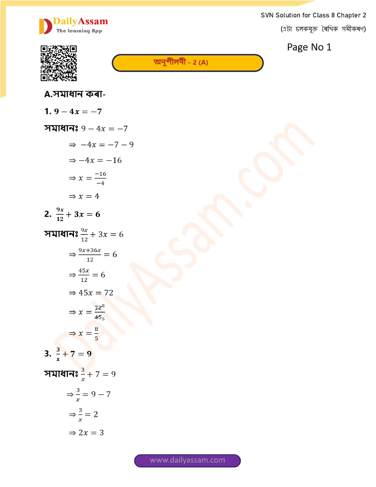 SVN Class 8 Mathematics Chapter 2 Solution | Sankardev Sishu Niketan Class 8 Mathematics Chapter 2 এটা চলকযুক্ত ৰৈখিক সমীকৰণ (linear equation with one variable) Answer | 2025 - 2026