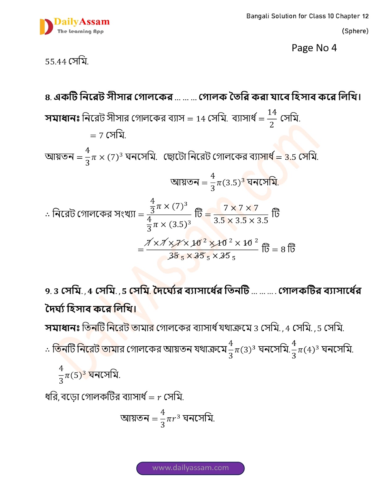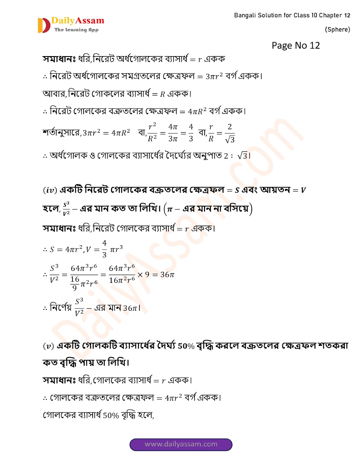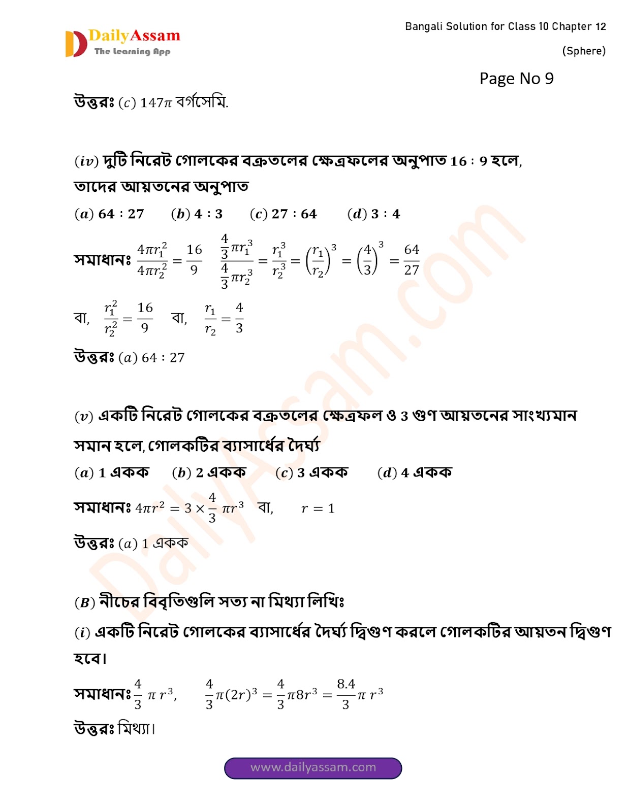 WBBSE Class 10 Mathematics Chapter 12 Solution | West Bengal Class 10 Mathematics Chapter 12 গোলক (Sphere) Answer | 2025 - 2026