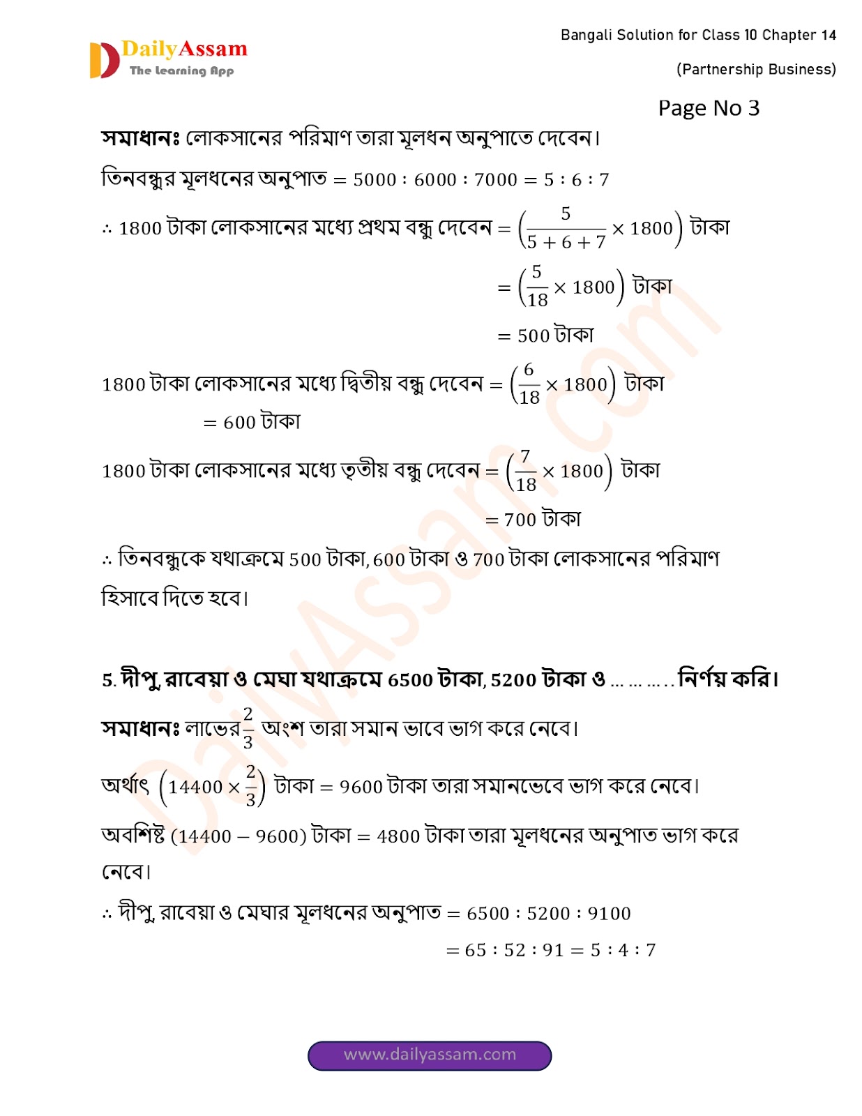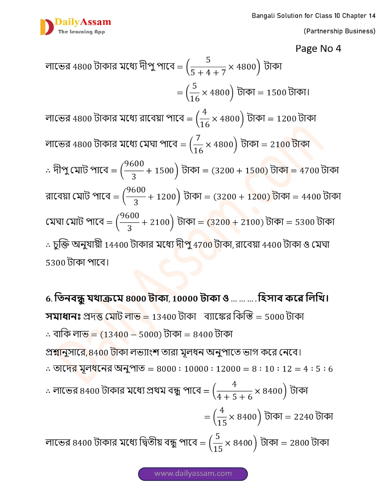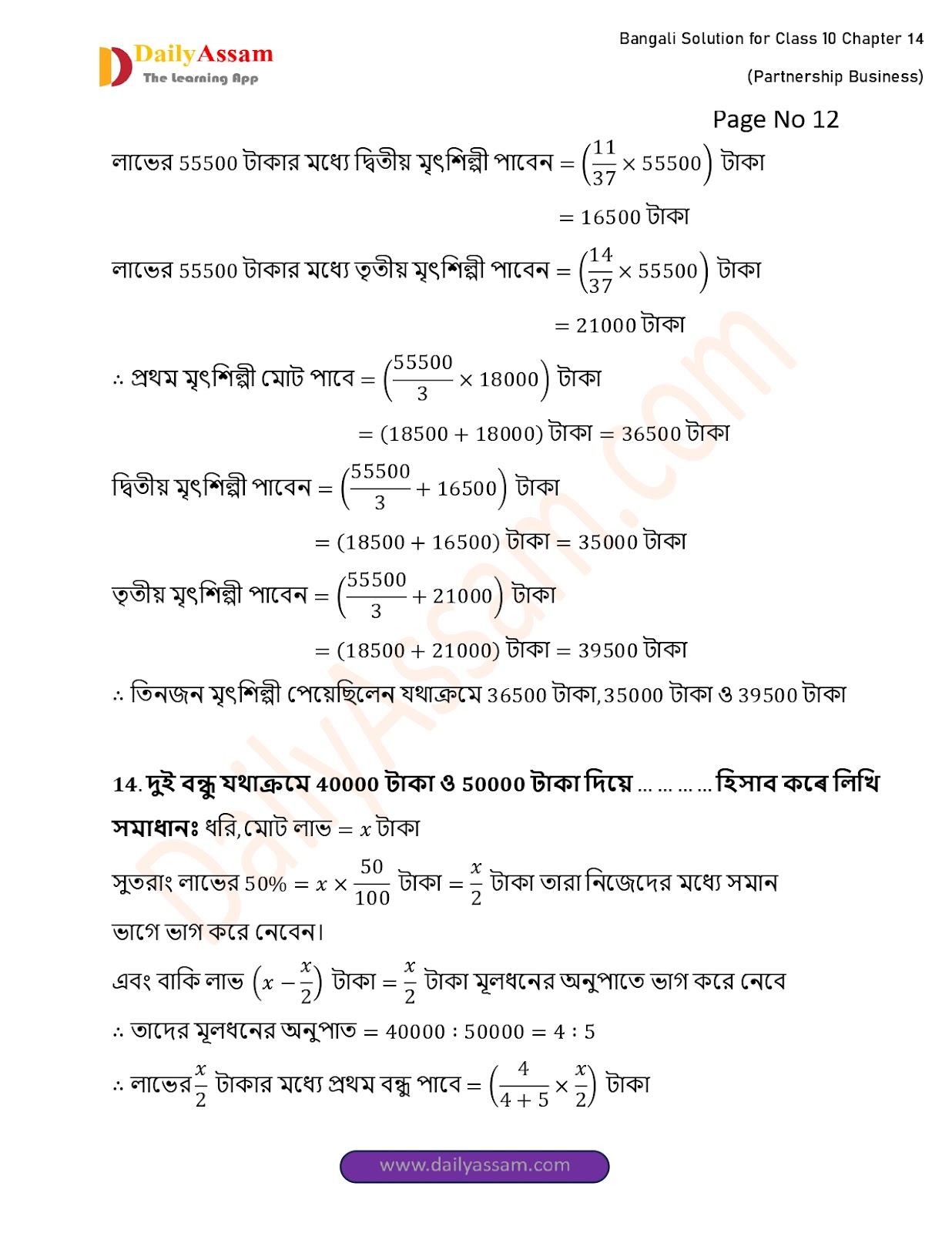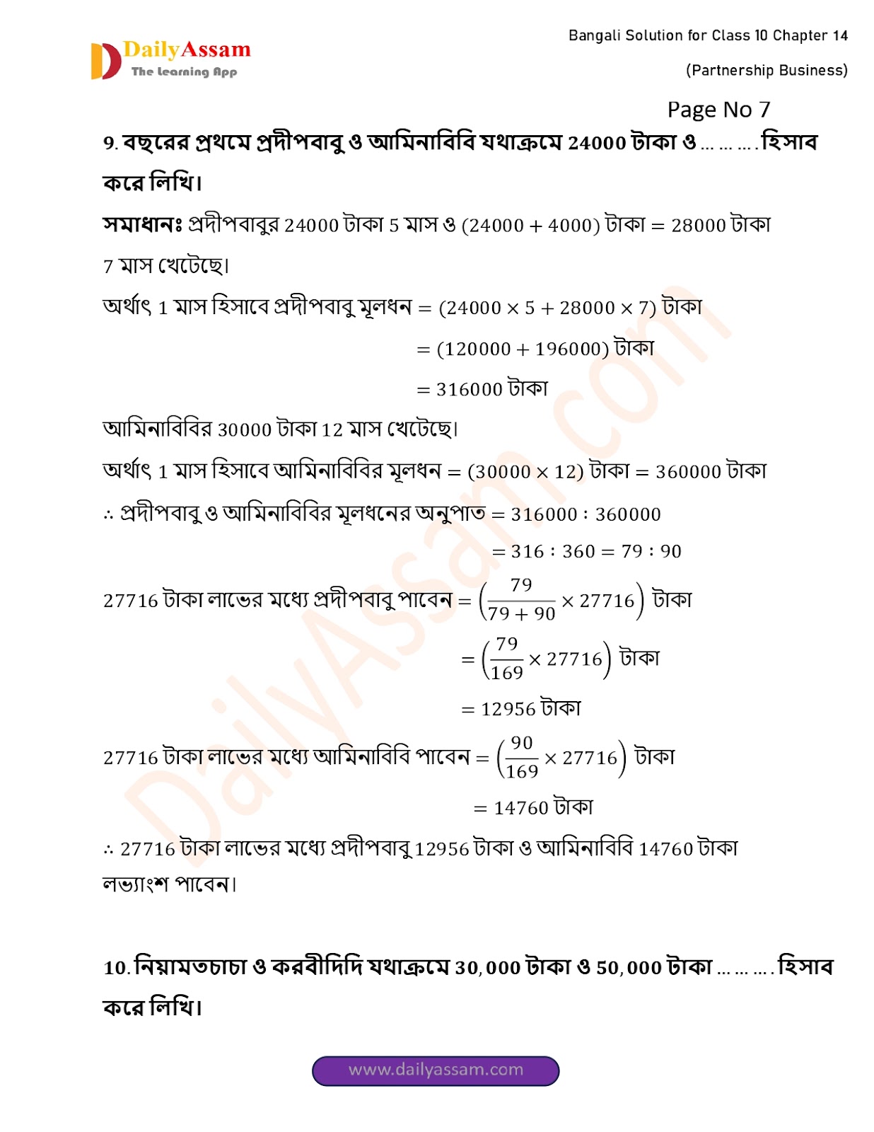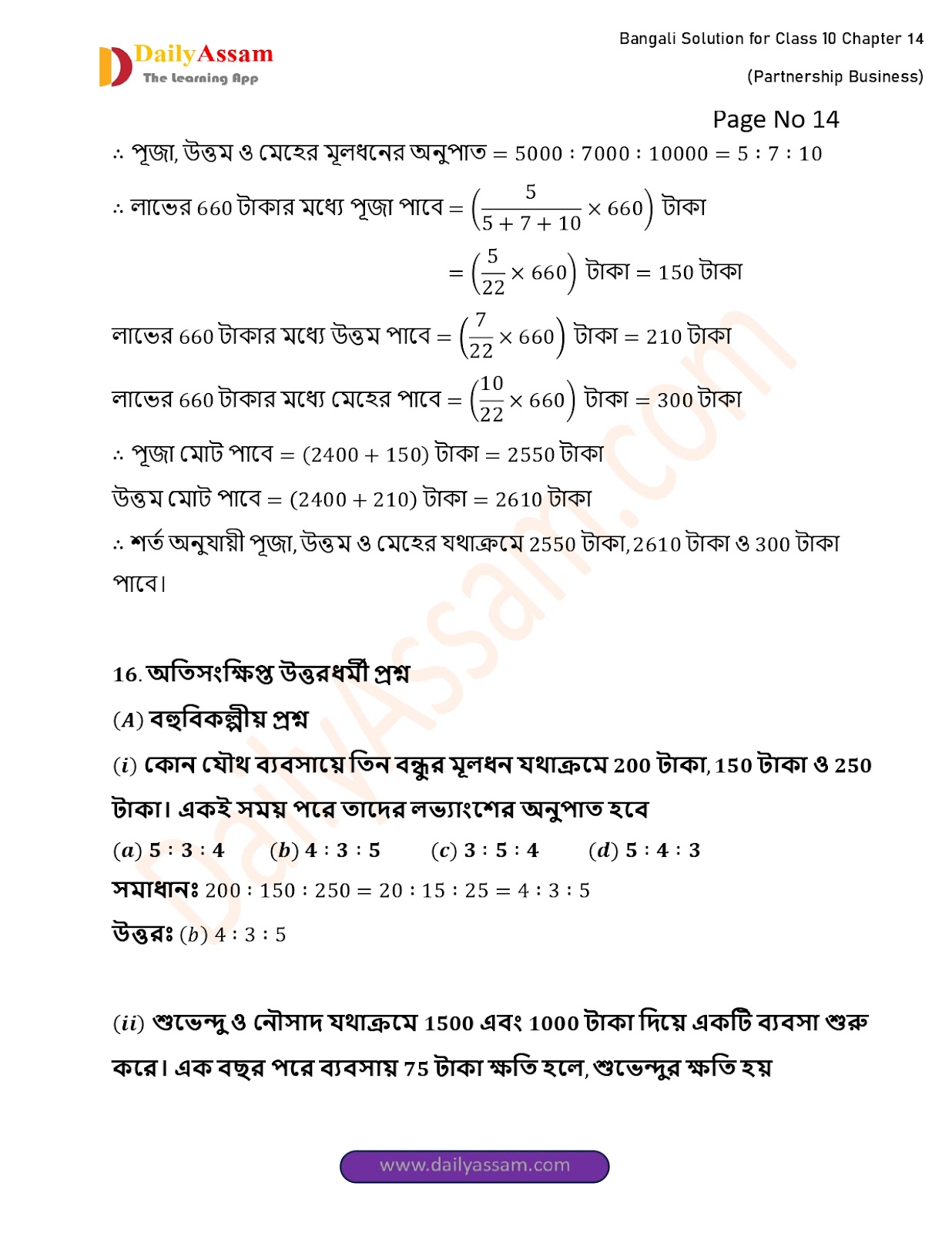 WBBSE Class 10 Mathematics Chapter 14 Solution | West Bengal Class 10 Mathematics Chapter 14 অংশীদারি কারবার (Partnership Business) Answer | 2025 - 2026