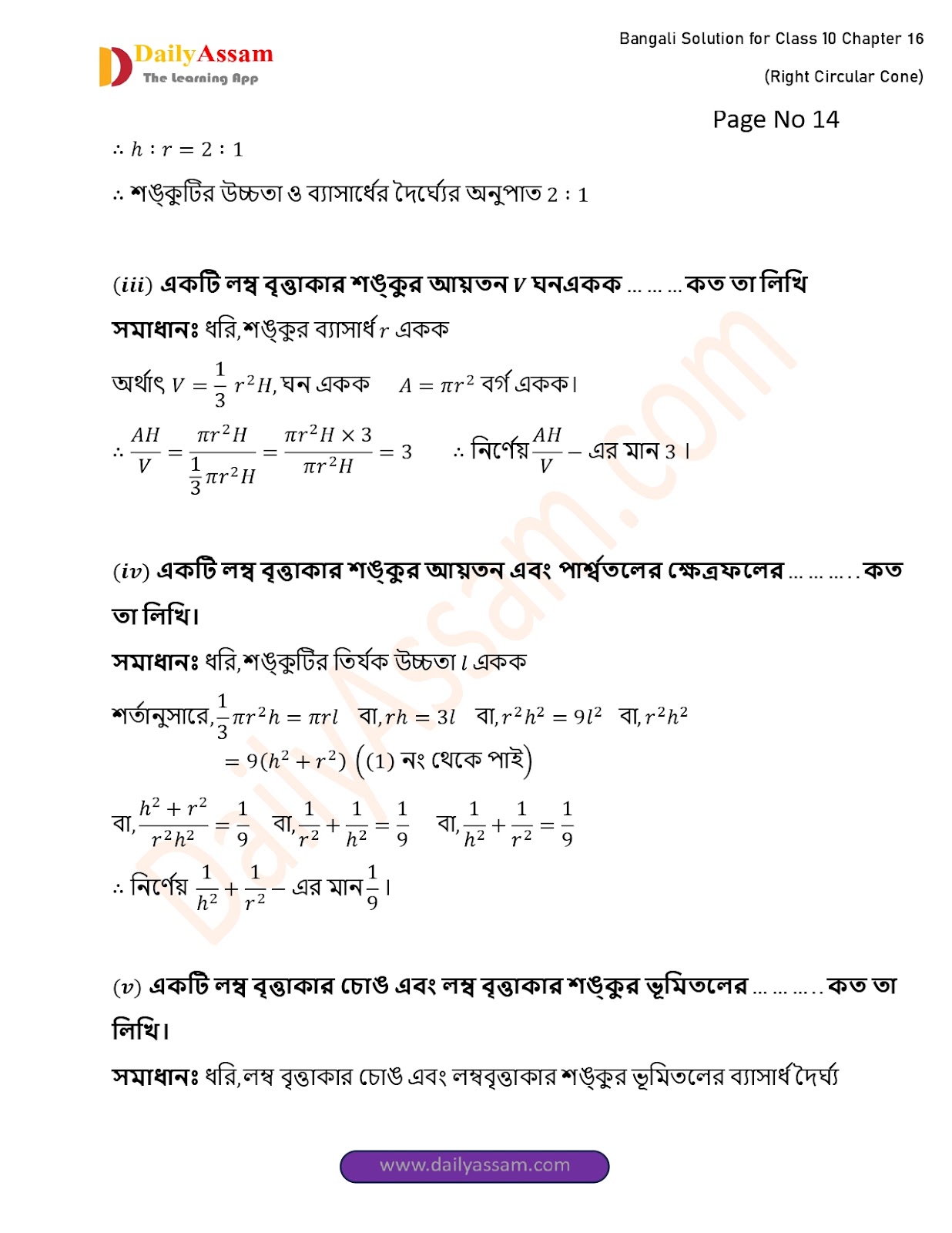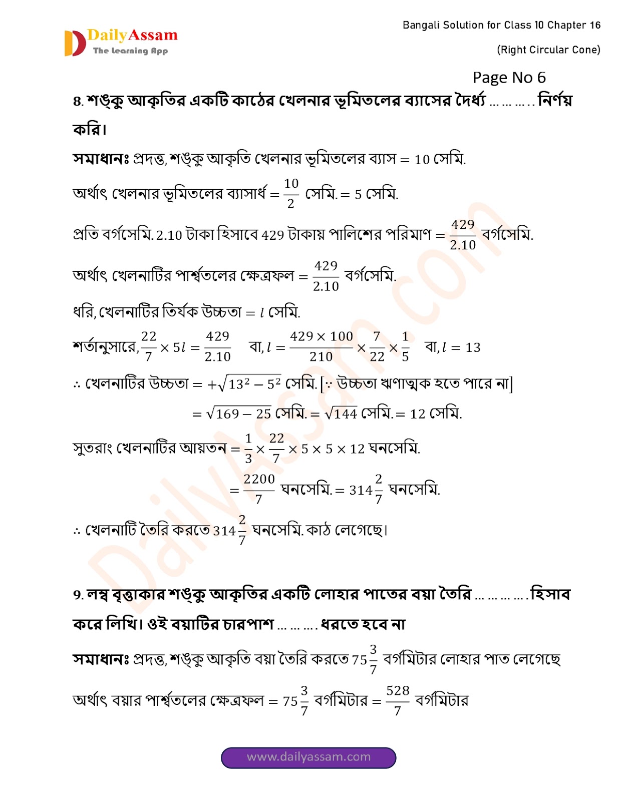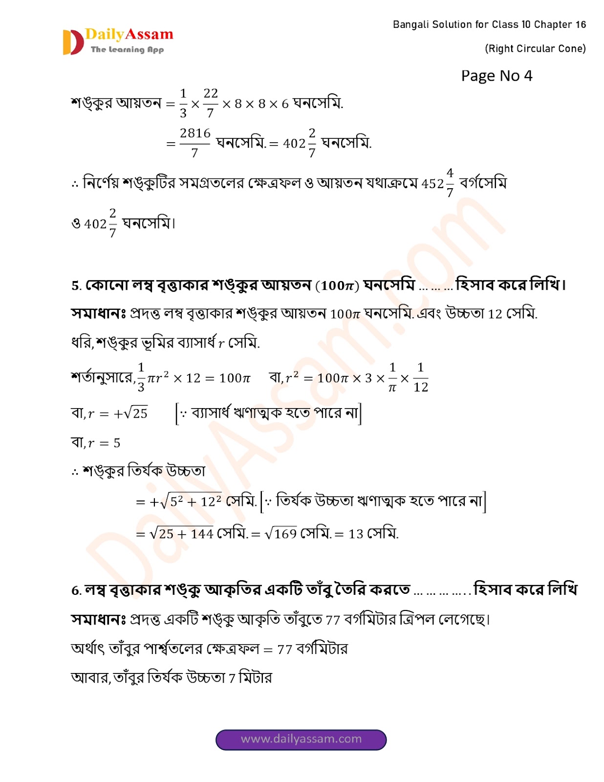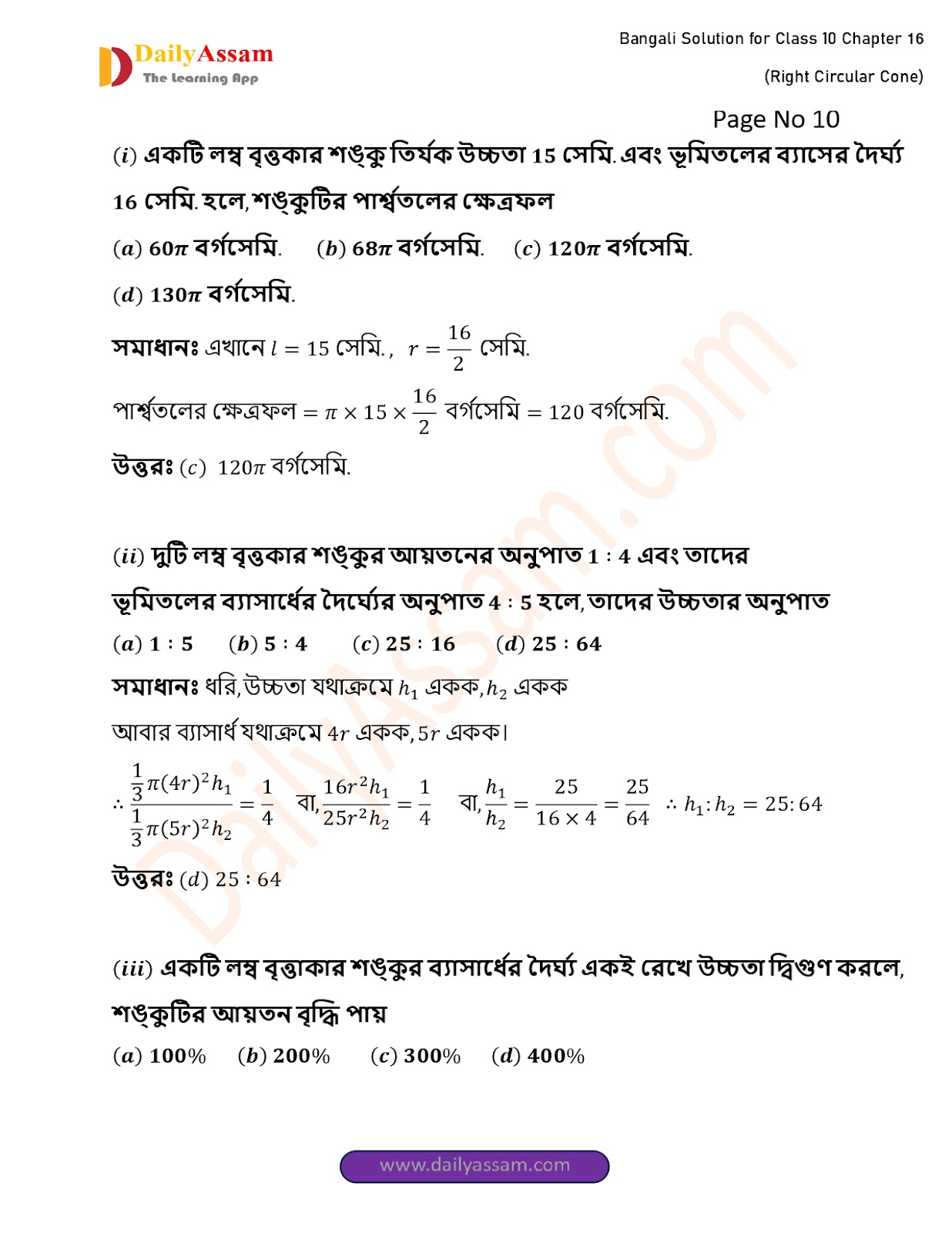 WBBSE Class 10 Mathematics Chapter 16 Solution | West Bengal Class 10 Mathematics Chapter 16 লম্ব বৃত্তাকার শঙ্কু (Right Circular Cone) Answer | 2025 - 2026