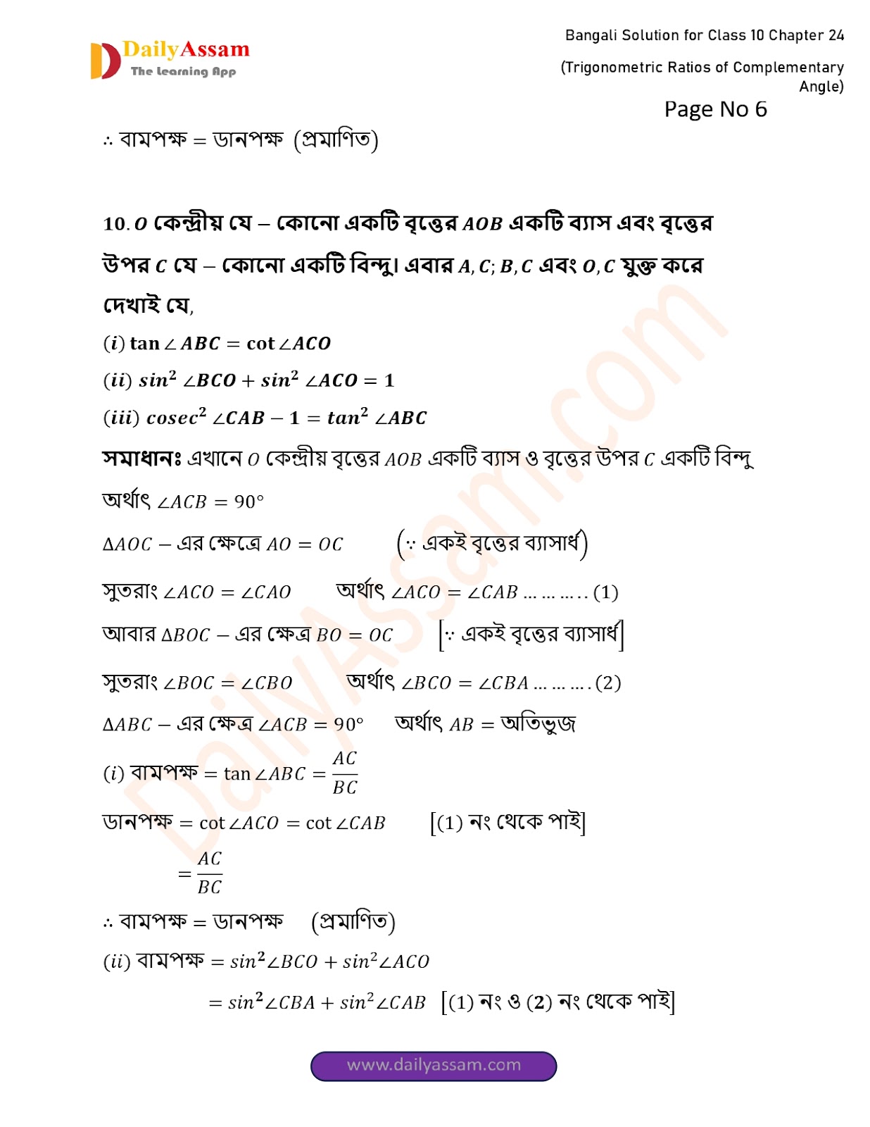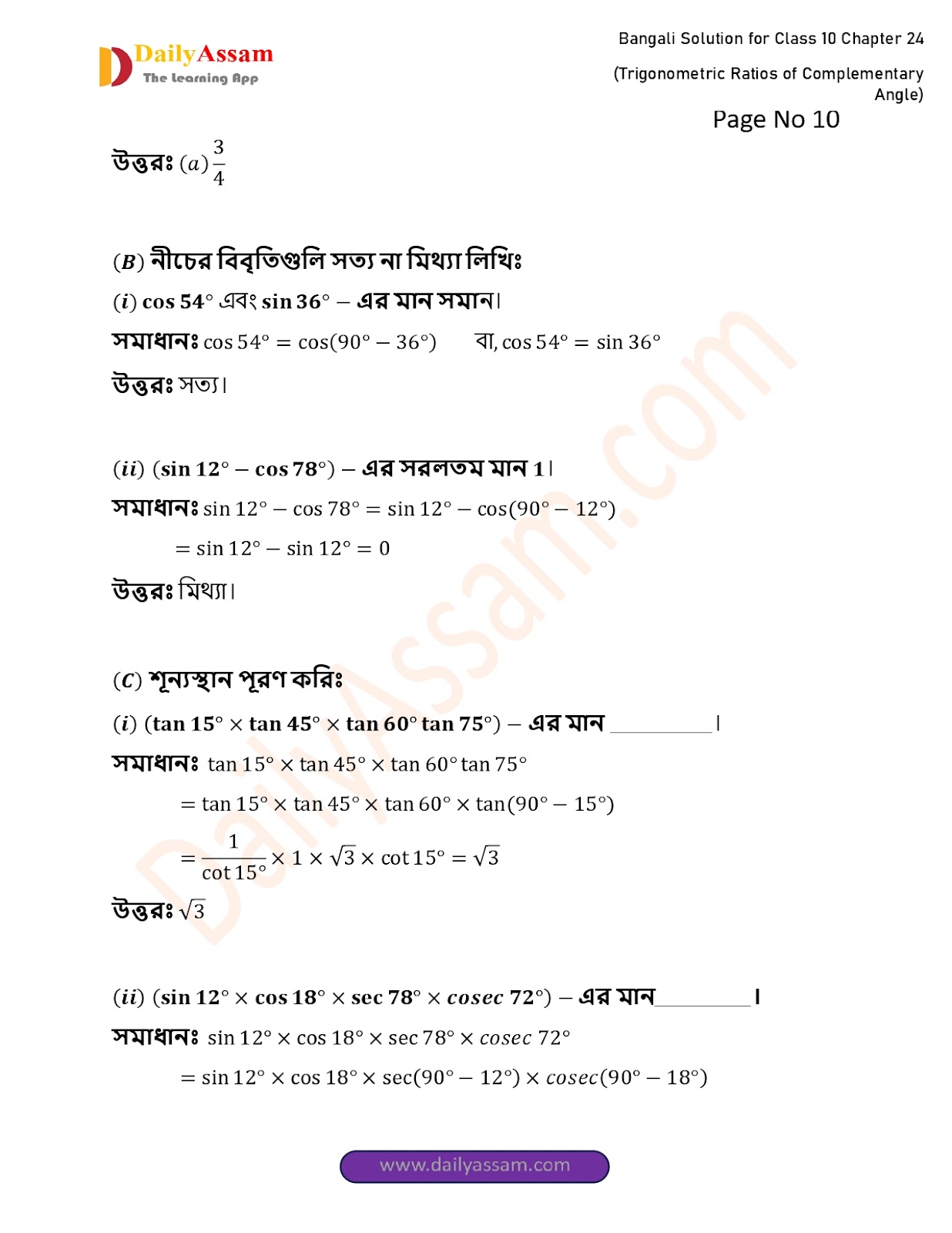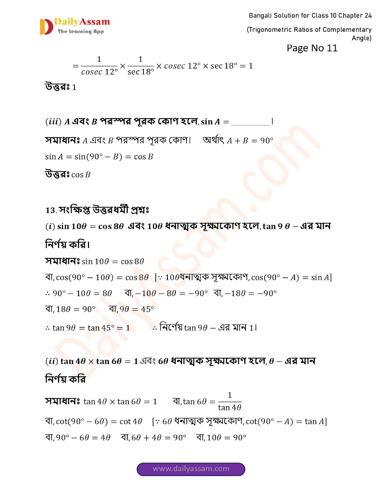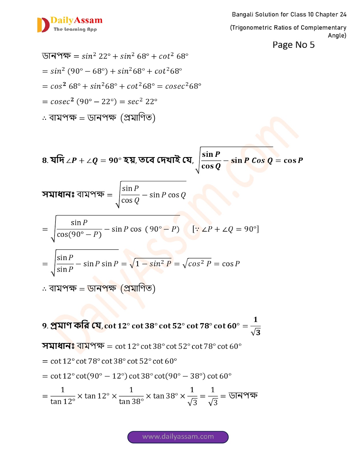 WBBSE Class 10 Mathematics Chapter 24 Solution | West Bengal Class 10 Mathematics Chapter 24 পূরক কোণের ত্রিকোণমিতিক অনুপাত (Trigonometric ratios of supplementary angles) Answer | 2025 - 2026