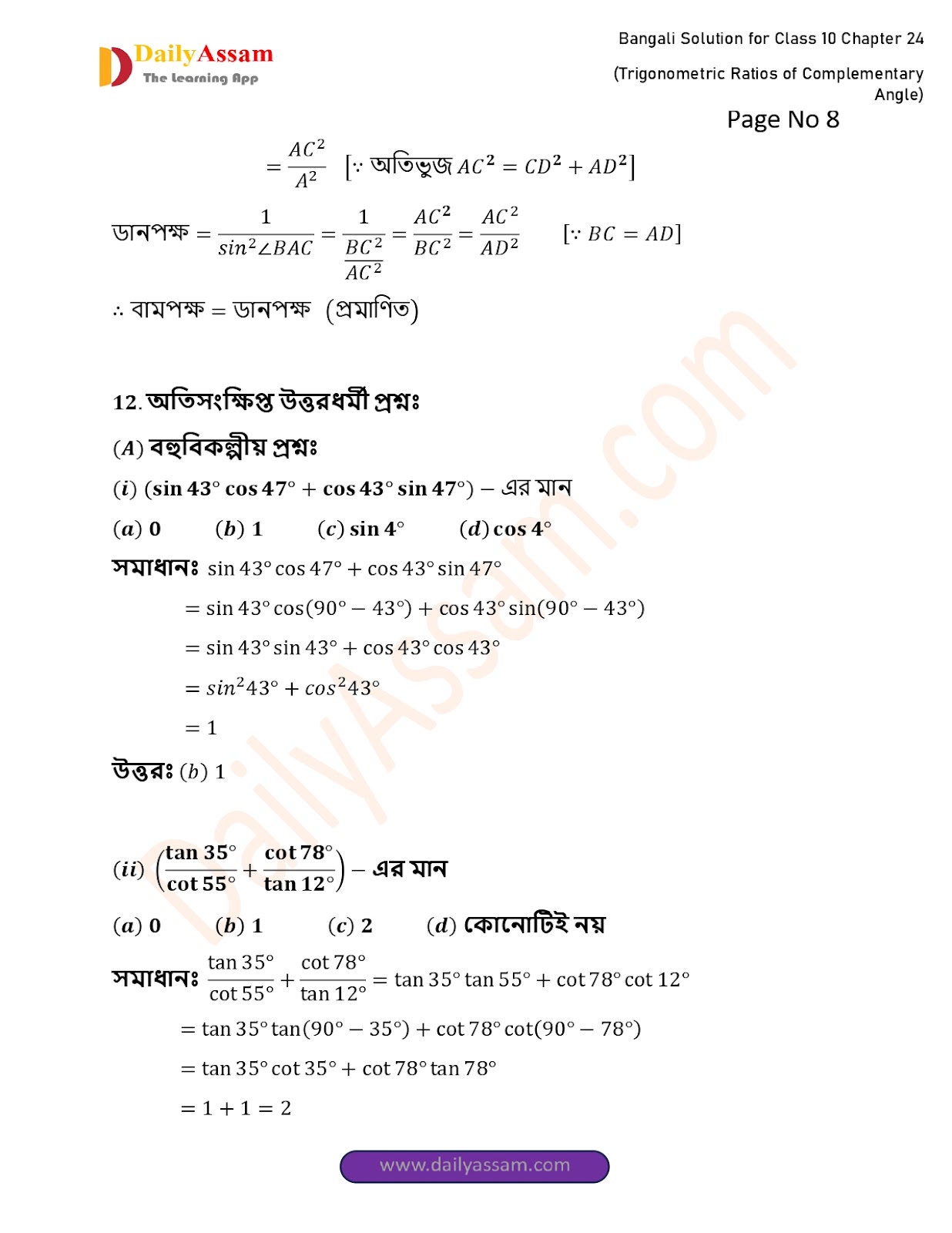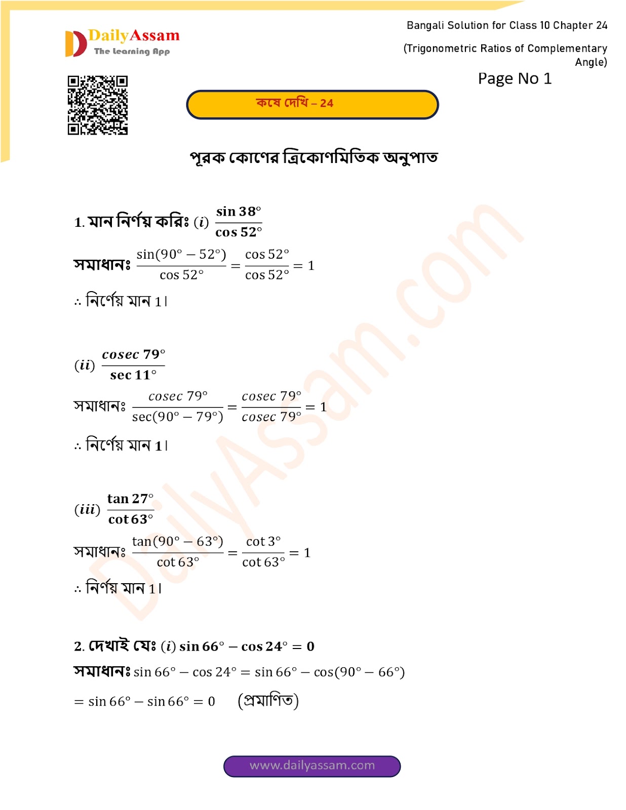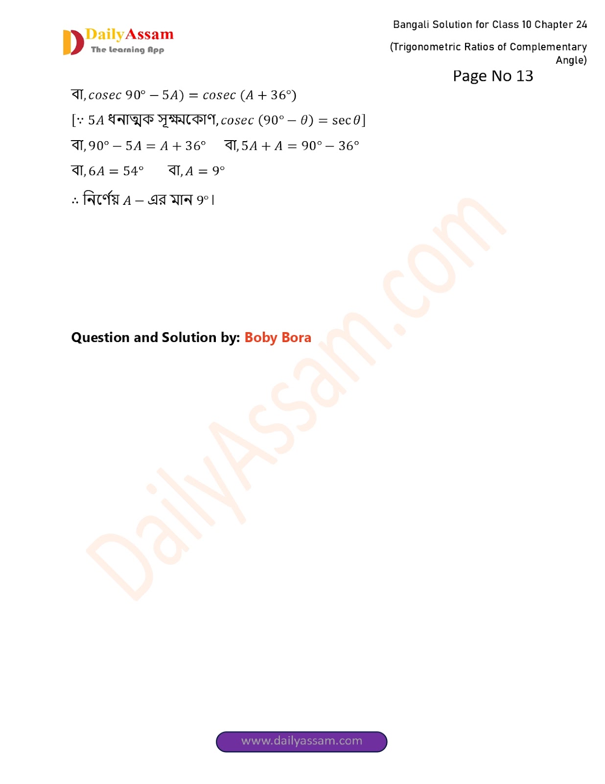 WBBSE Class 10 Mathematics Chapter 24 Solution | West Bengal Class 10 Mathematics Chapter 24 পূরক কোণের ত্রিকোণমিতিক অনুপাত (Trigonometric ratios of supplementary angles) Answer | 2025 - 2026