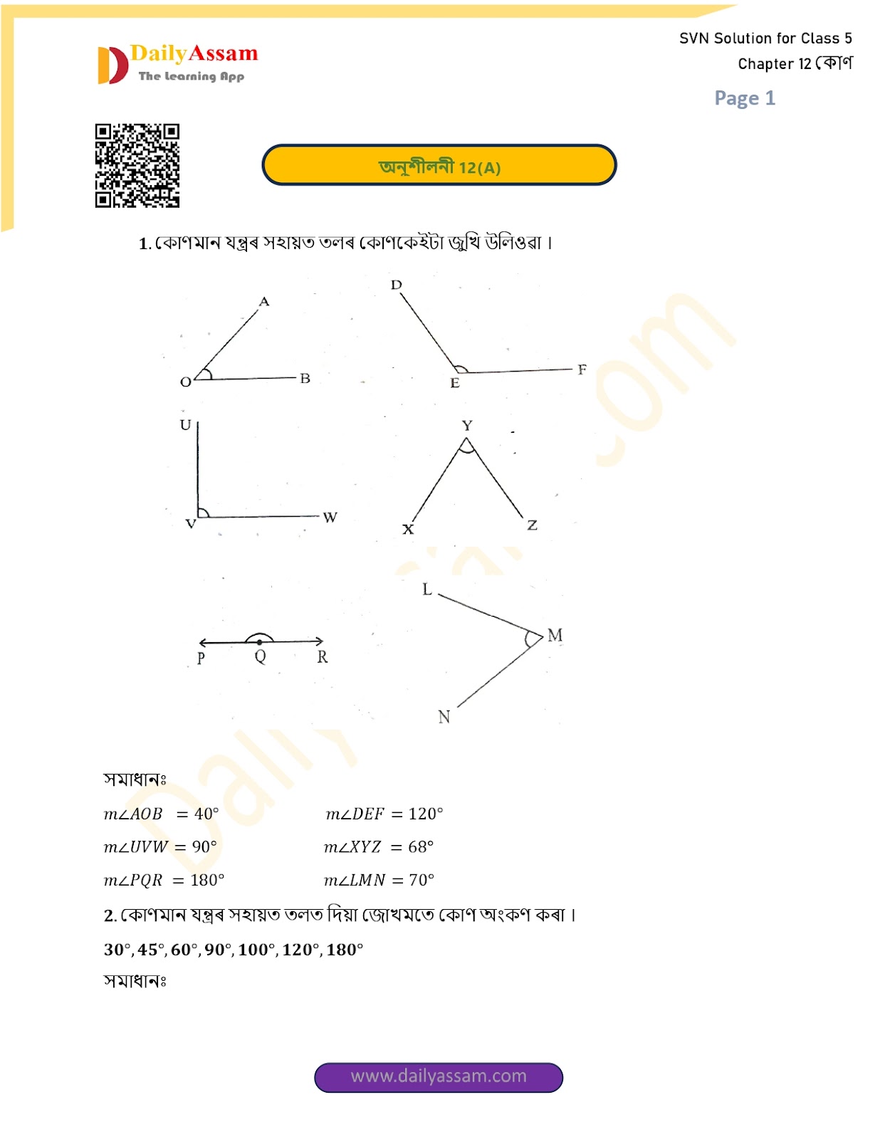 SVN Class 5 Mathematics Chapter 12 Solution | Sankardev Sishu Niketan Class 5 Mathematics Chapter 12 কোণ (Angle) Answer | 2025 - 2026