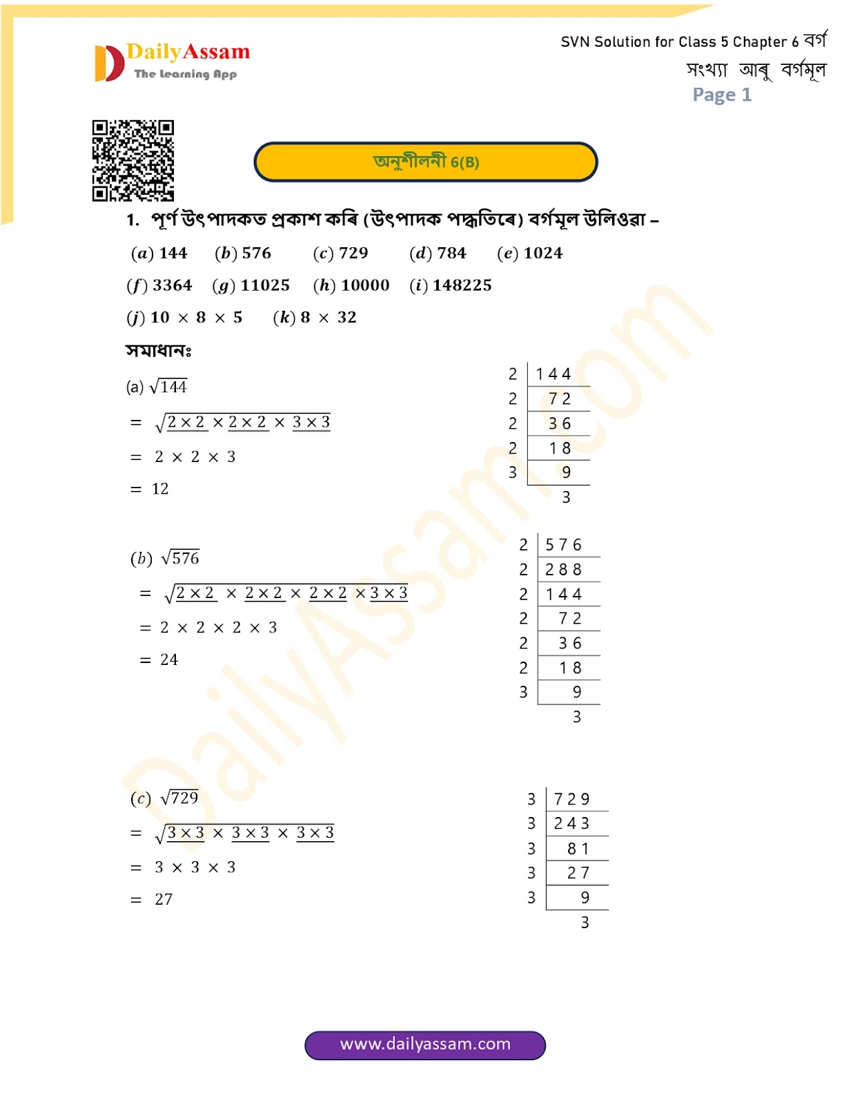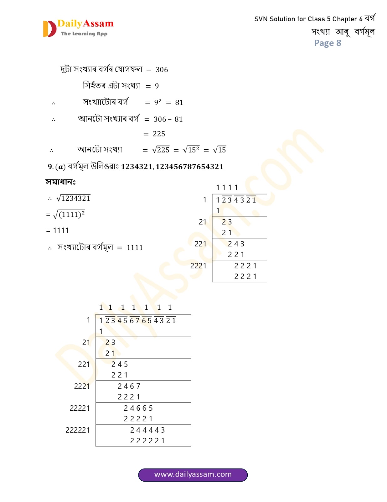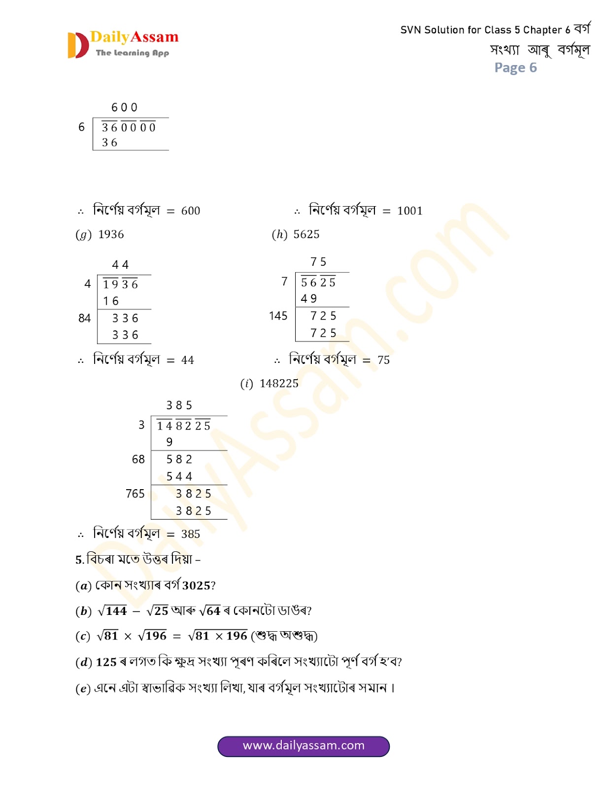 SVN Class 5 Mathematics Chapter 6 Solution | Sankardev Sishu Niketan Class 5 Mathematics Chapter 6 বৰ্গ সংখ্য়া আৰু বৰ্গমূল (Square numbers and square roots) Answer | 2025 - 2026